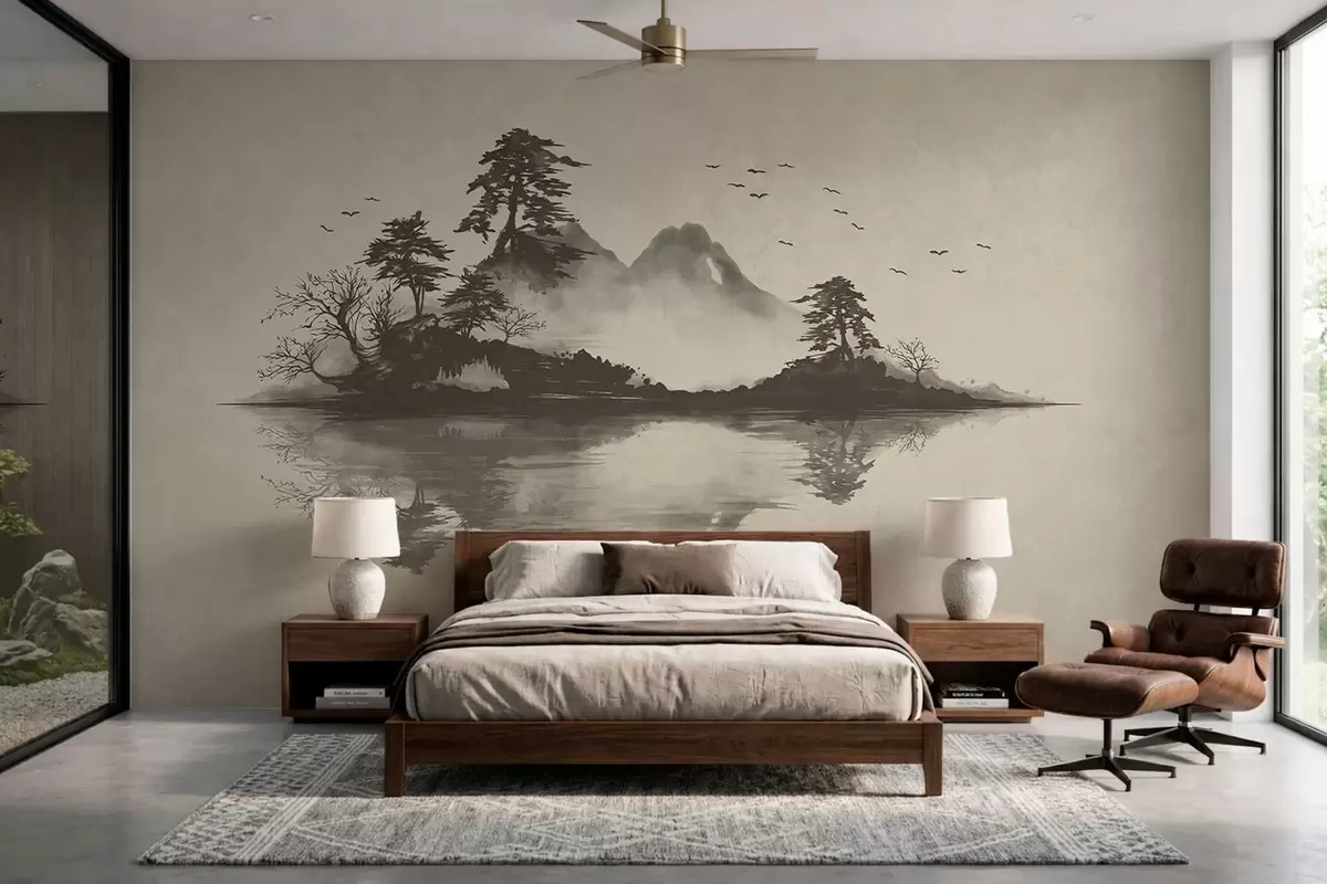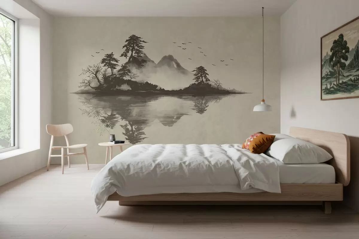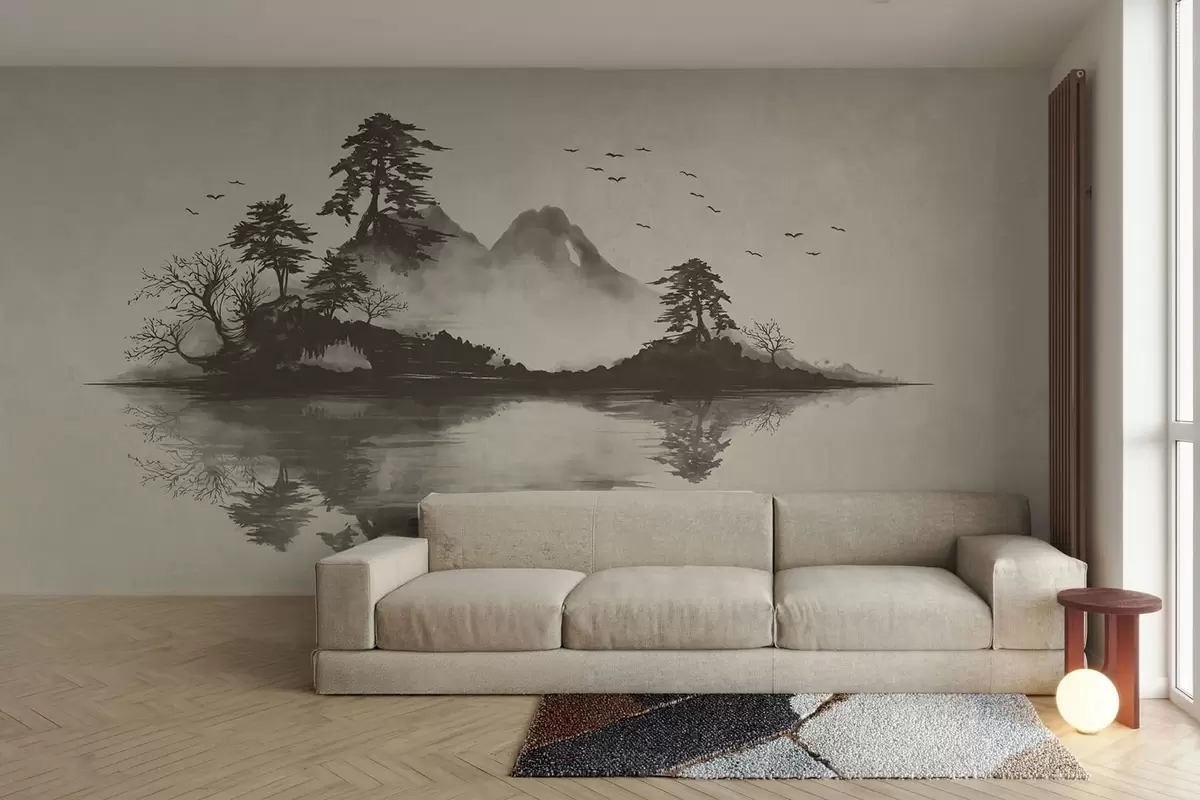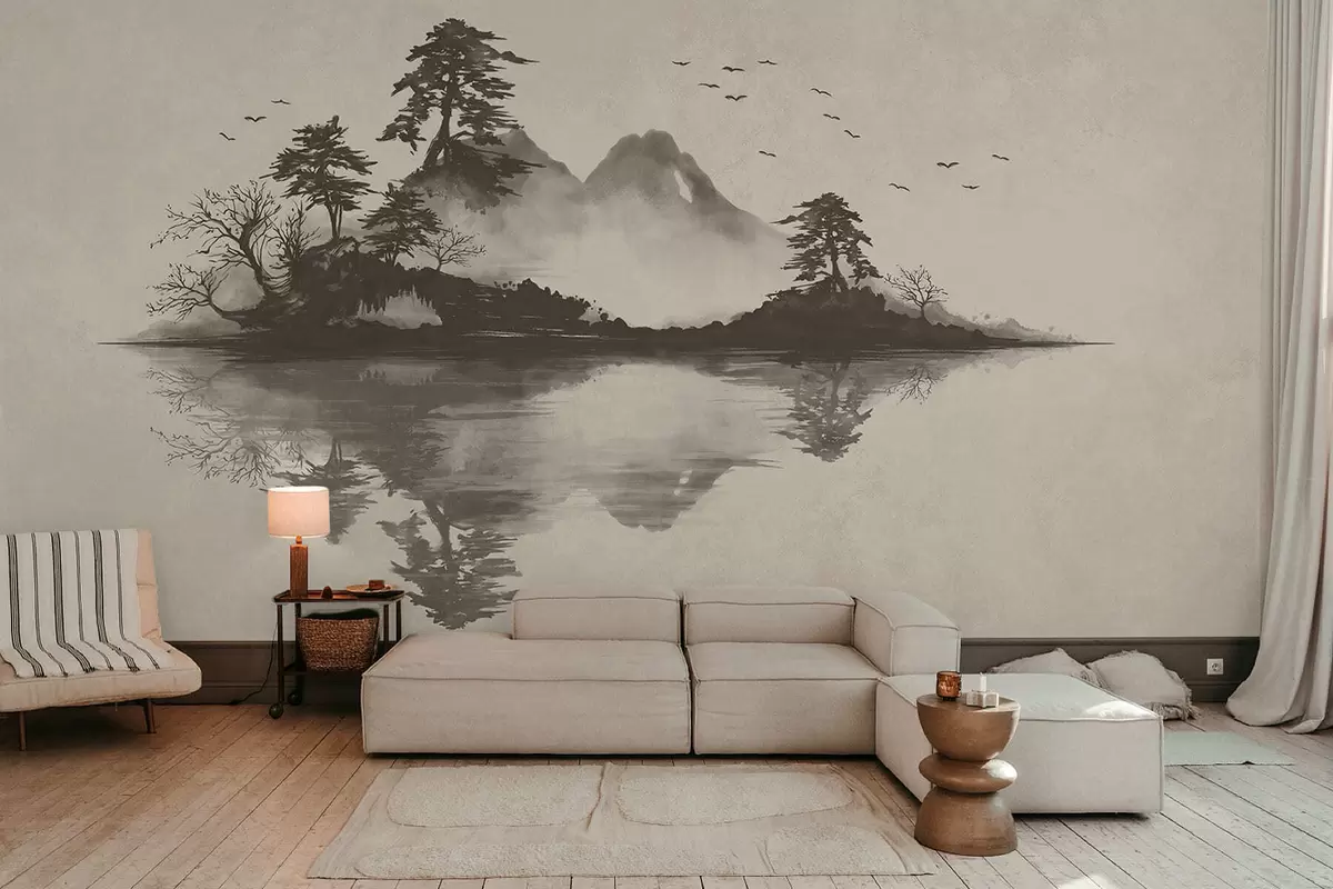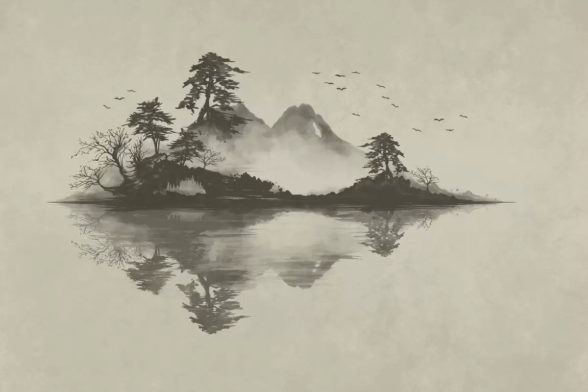 Тапете за зид Планински пејзаж Суми-е у меким сивим тоновима бр. w05124v1
