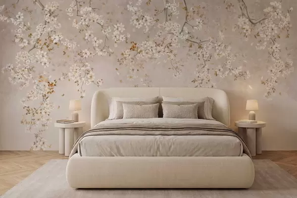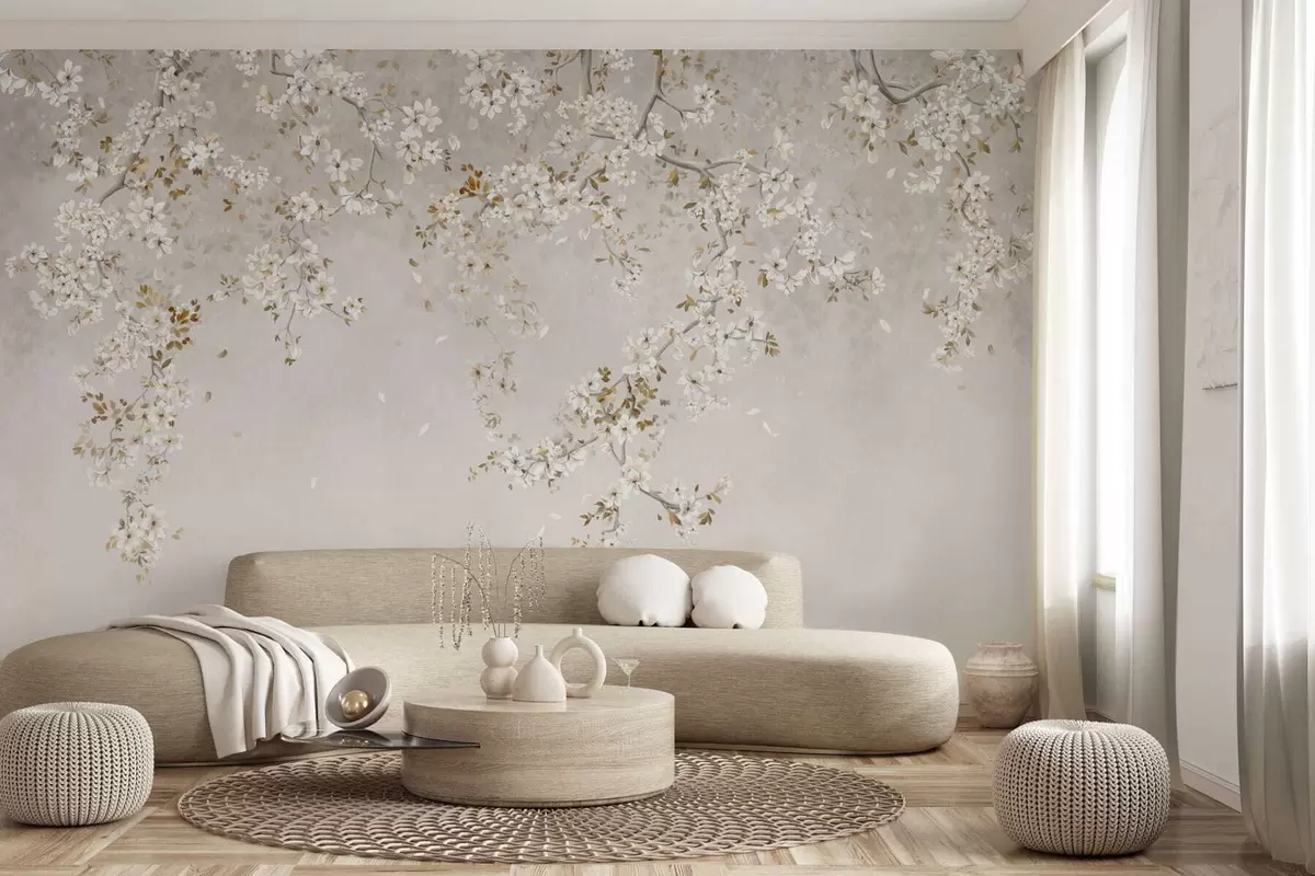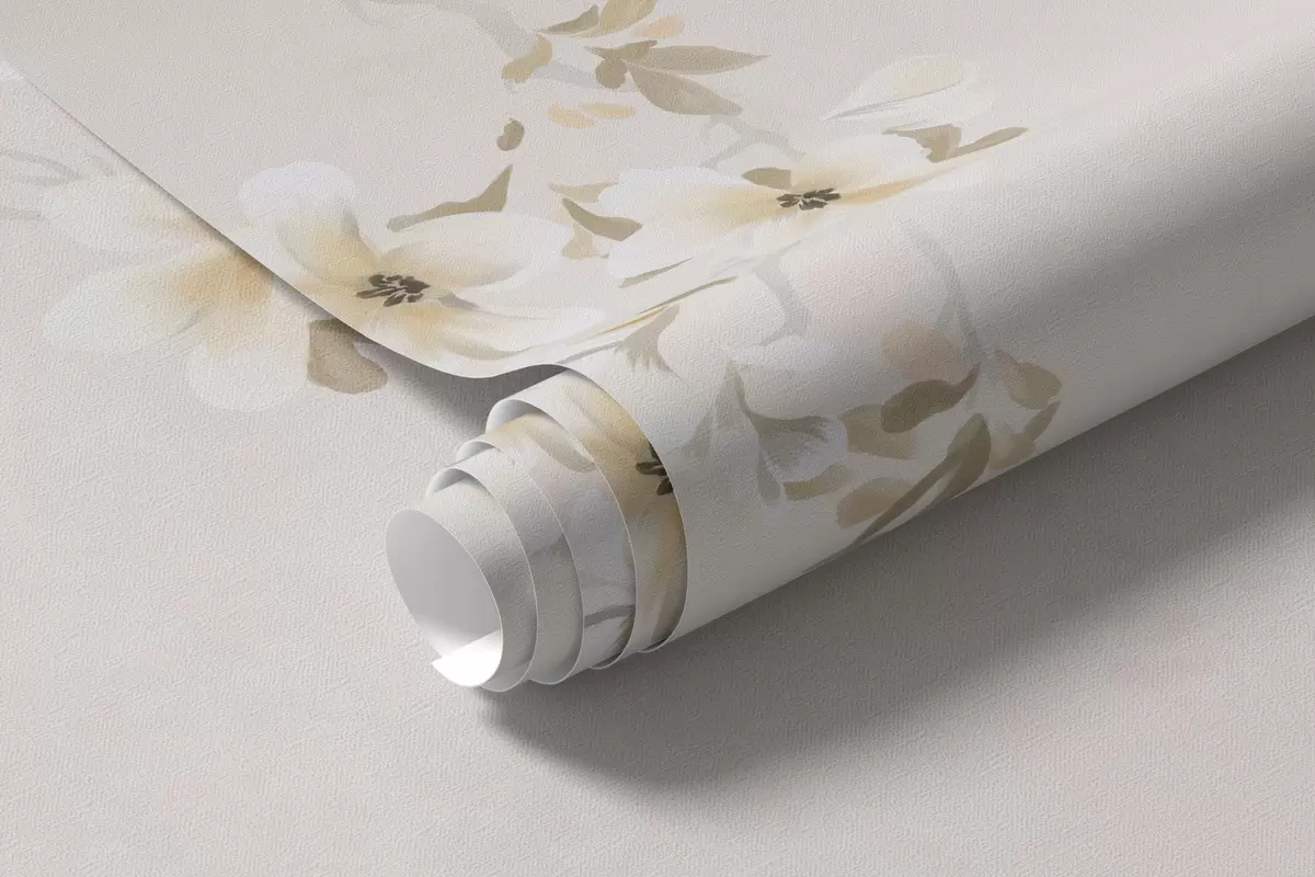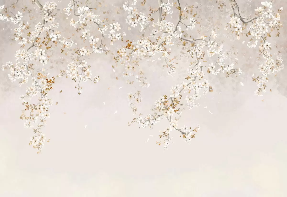 Тапете за зид Гране са белим цветовима на мекој беж позадини бр. w05129