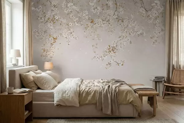 Тапете за зид Гране са белим цветовима на мекој беж позадини бр. w05129