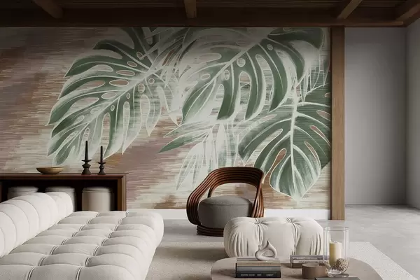 Тапете за зид Зелено лишће на топлој текстурираној апстрактној подлози бр. w05130v3