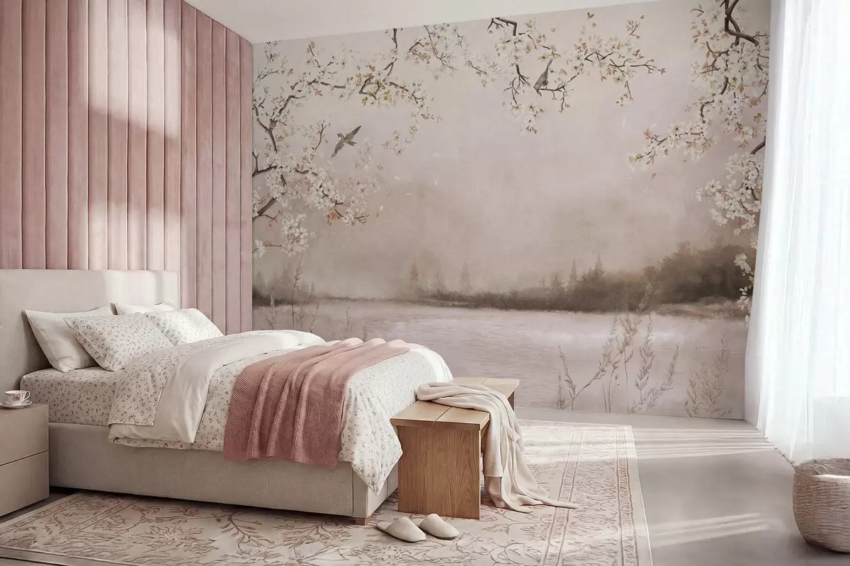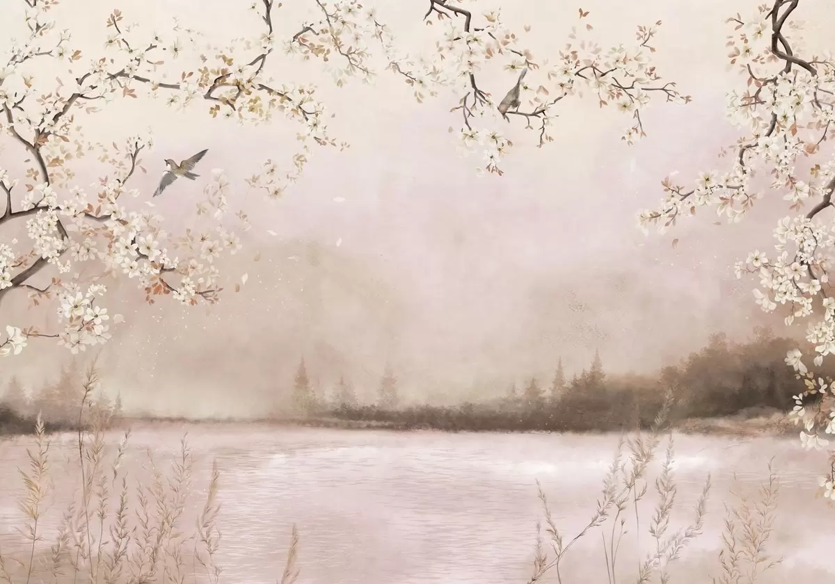 Тапете за зид Цветајуће гране изнад мирног језера са птицама у магли бр. w05155v1