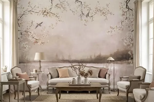 Тапете за зид Цветајуће гране изнад мирног језера са птицама у магли бр. w05155v1