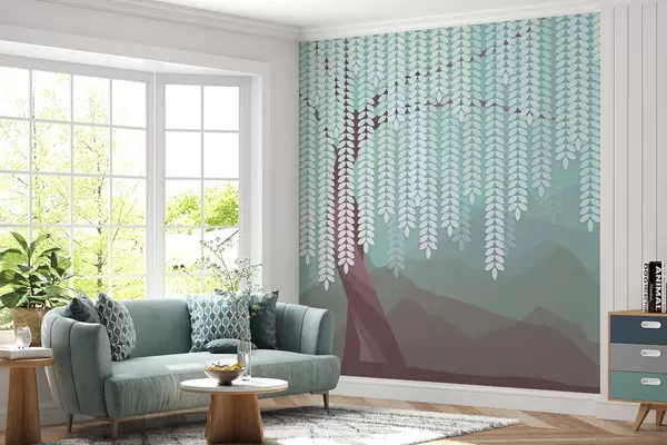 Тапете за зид стилизована врба са висећим лишћем на позадини минималистичких планина у нијансама чоколаде и тиркизне боје бр. w05232v1