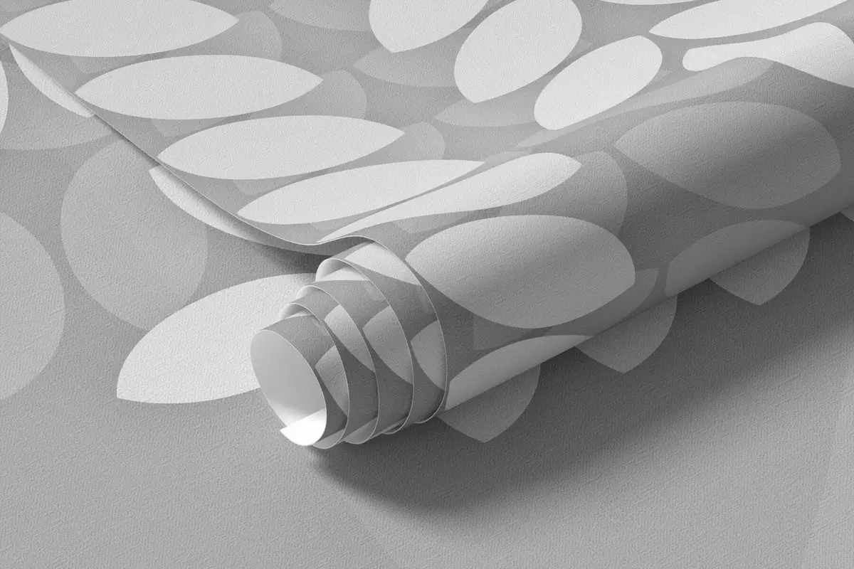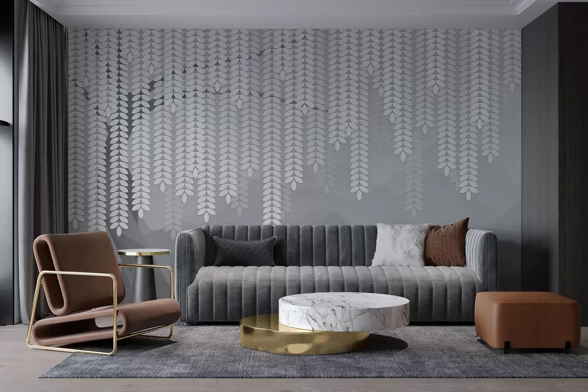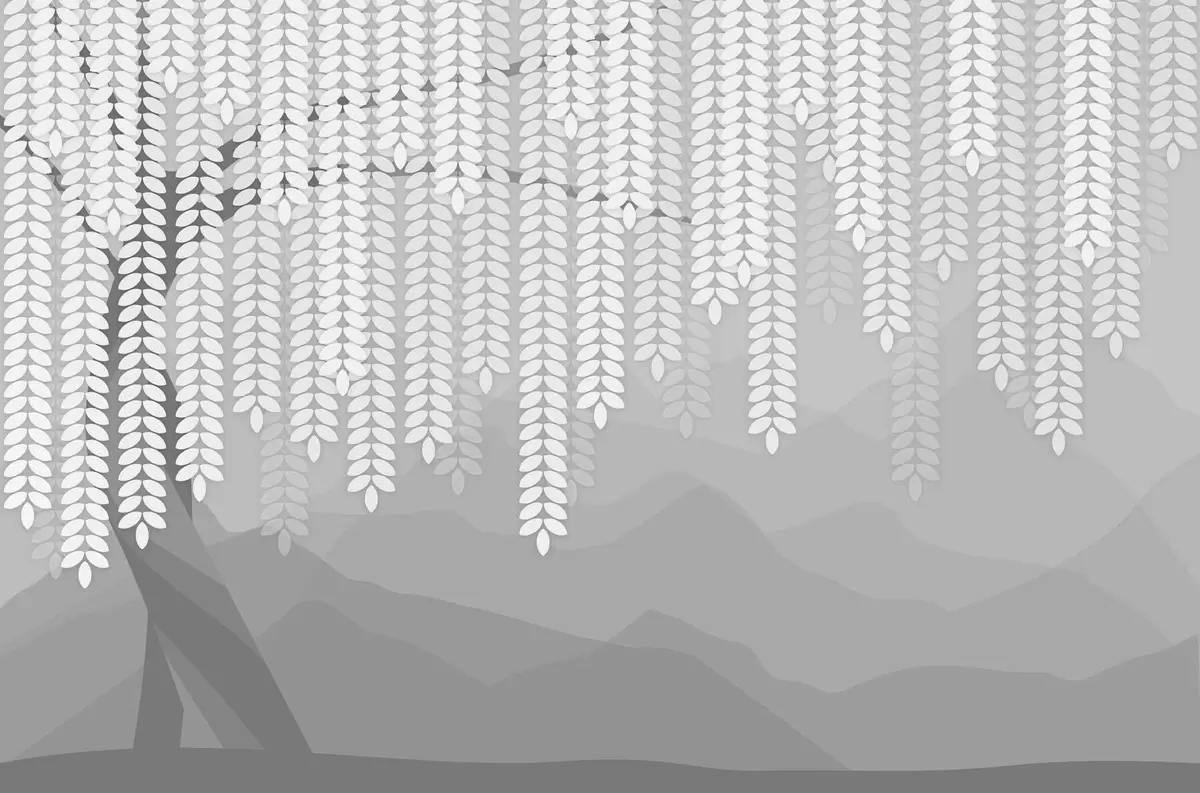 Тапете за зид стилизована врба са висећим лишћем на позадини минималистичких планина у нијансама сиве бр. w05232v3
