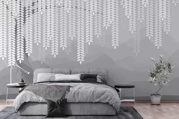 Тапете за зид стилизована врба са висећим лишћем на позадини минималистичких планина у нијансама сиве бр. w05232v3