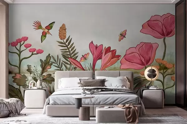 Тапете за зид Светло цвеће са птицама и лептирима бр. w05321