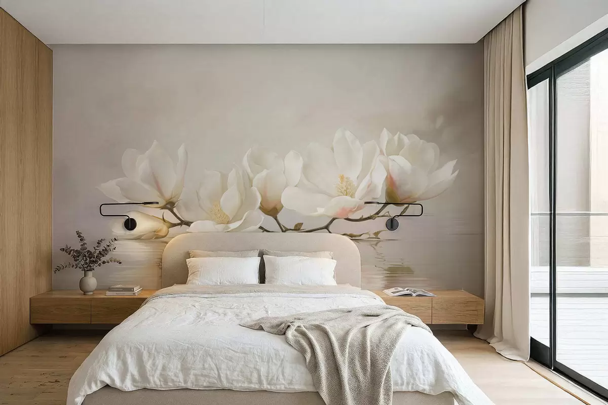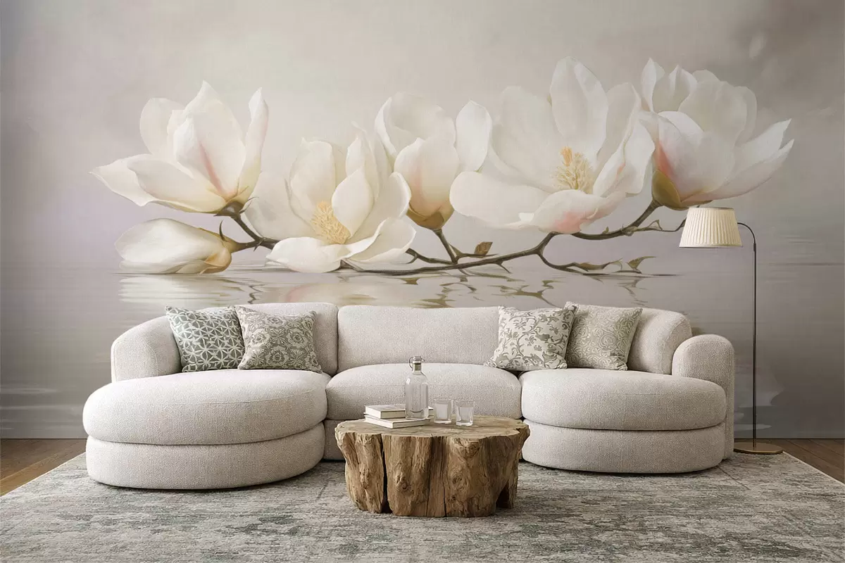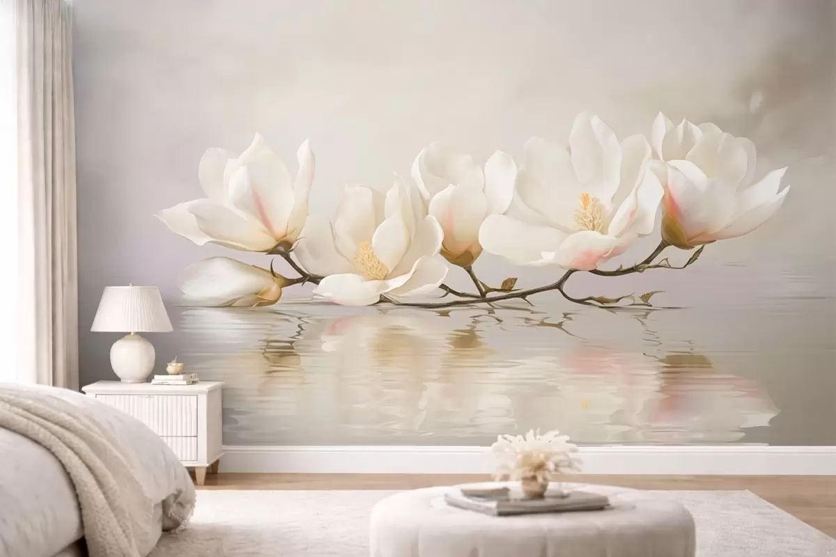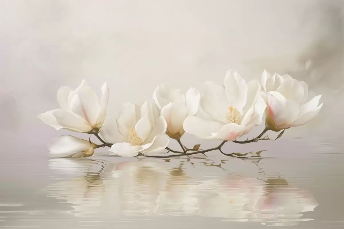 Тапете за зид Светли цветови магнолије на грани изнад одраза у води бр. w05353