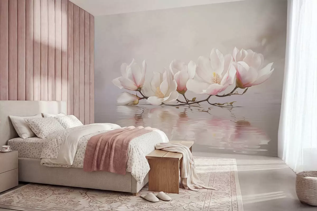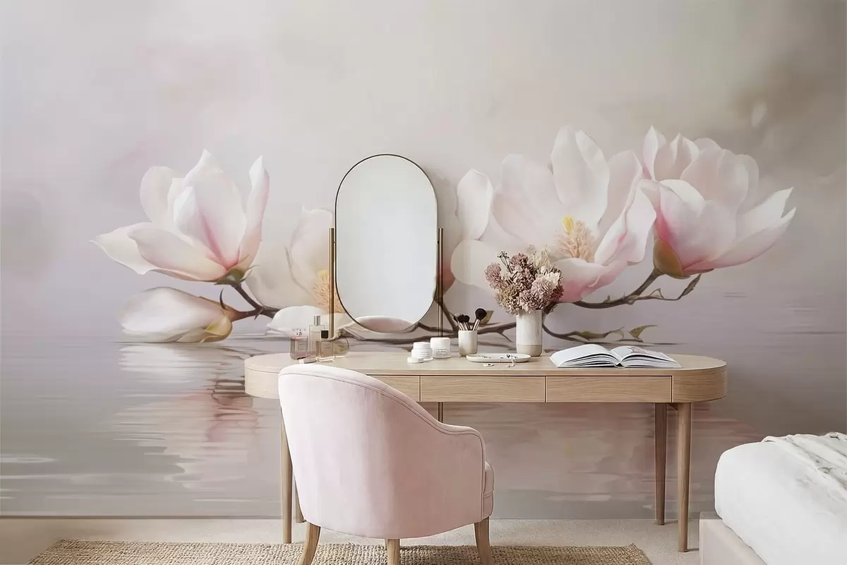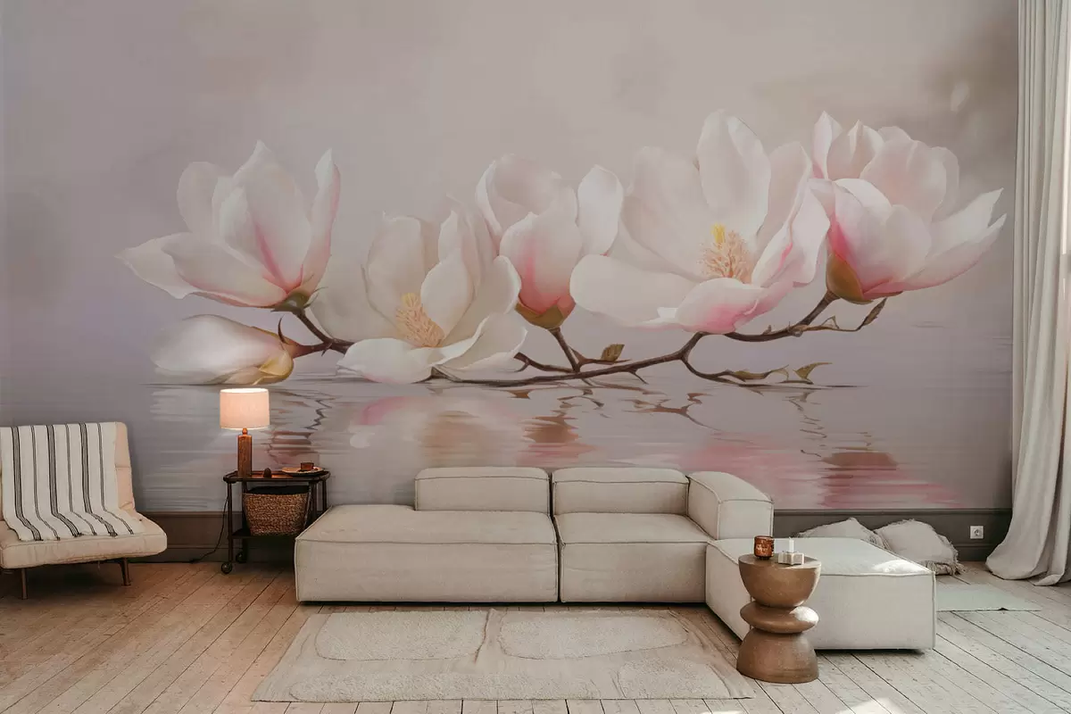 Тапете за зид Грана магнолије са цветовима изнад одраза у мирној води бр. w05353v1