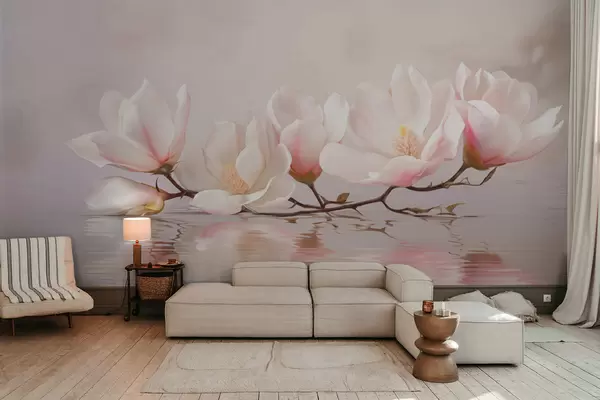 Тапете за зид Грана магнолије са цветовима изнад одраза у мирној води бр. w05353v1