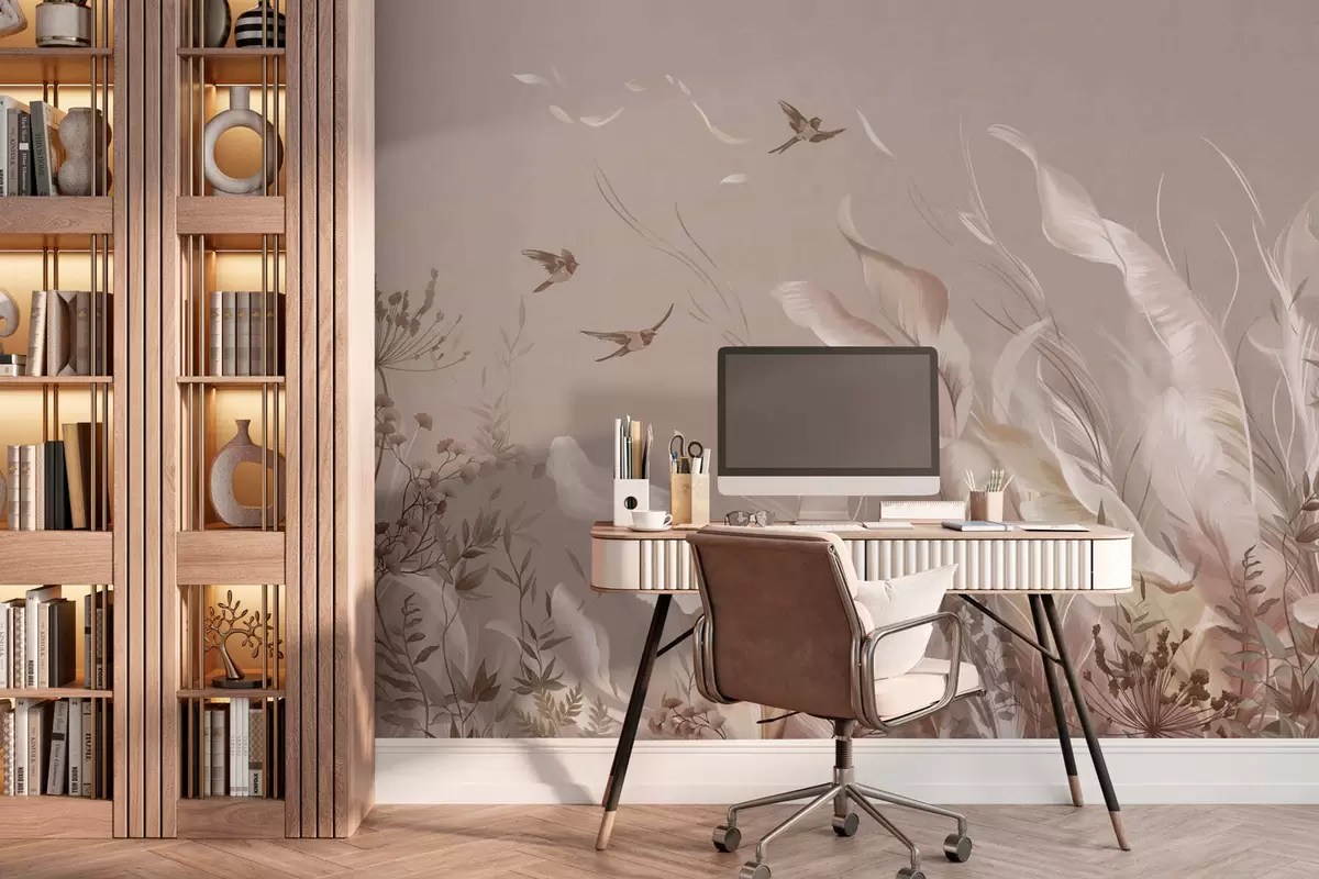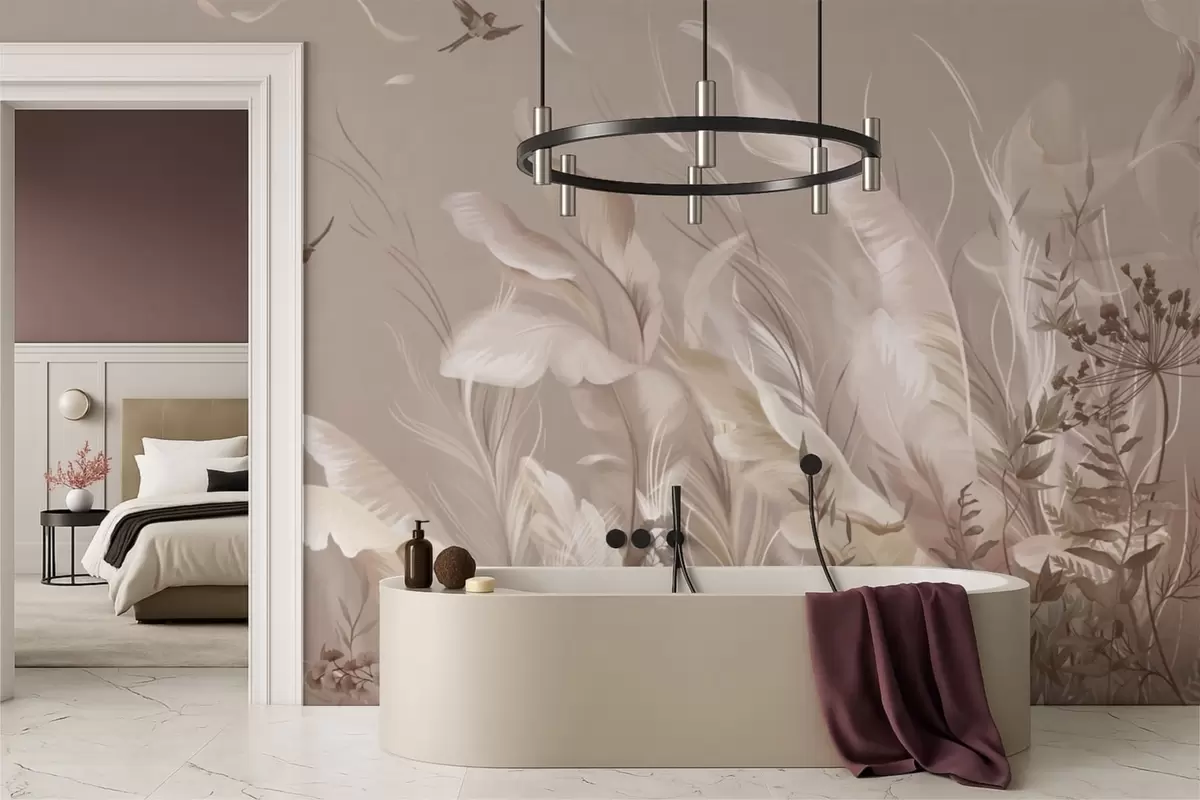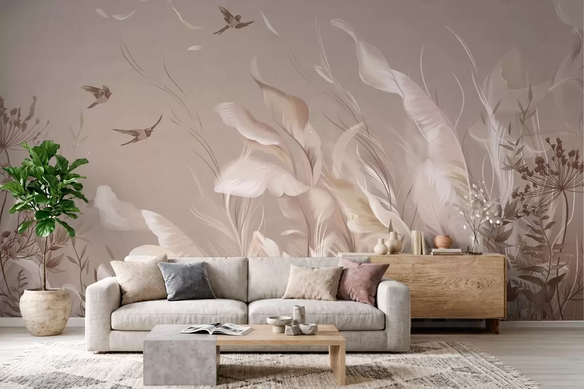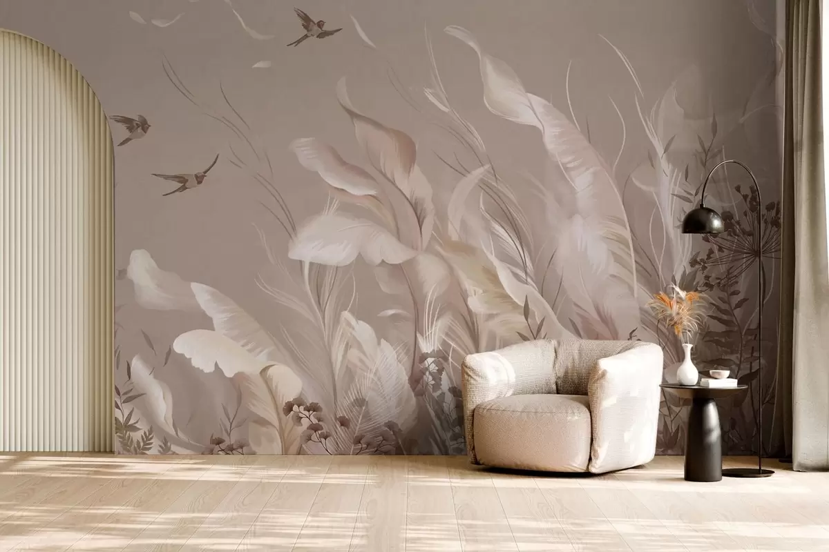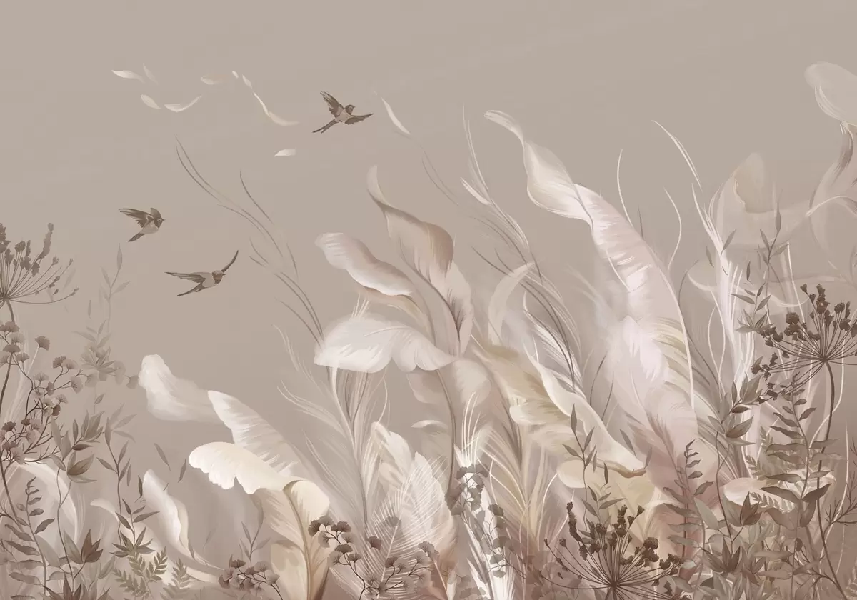 Тапете за зид Светло перје и биљке са птицама у пастелним тоновима бр. w05395v1