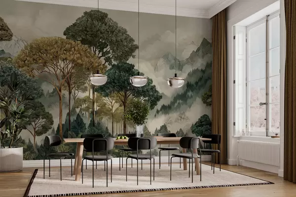 Тапете за зид Шума са високим дрвећем у магловитим планинама бр. w05410