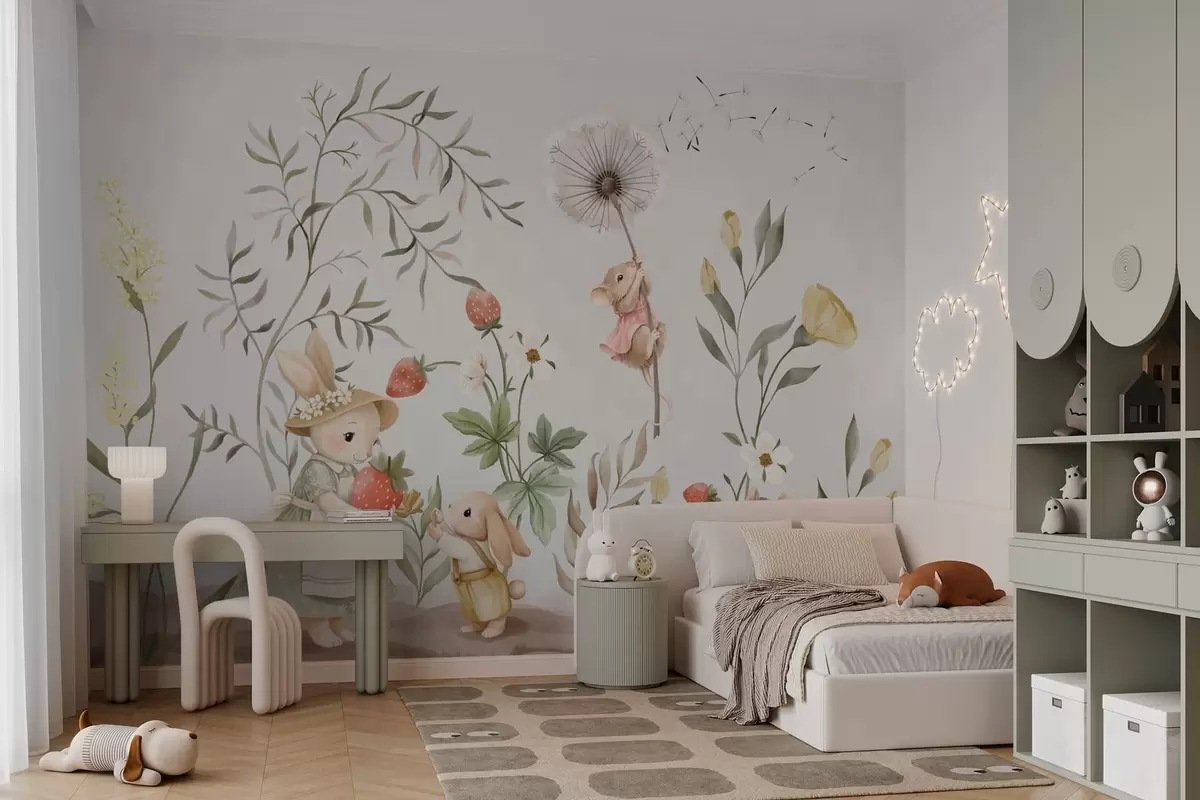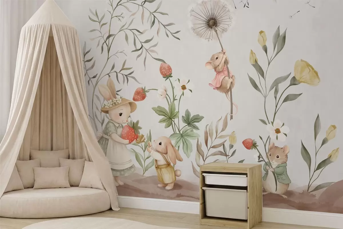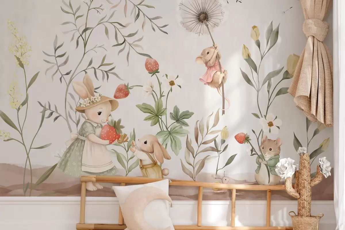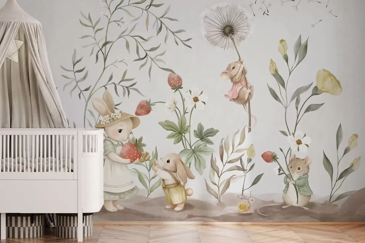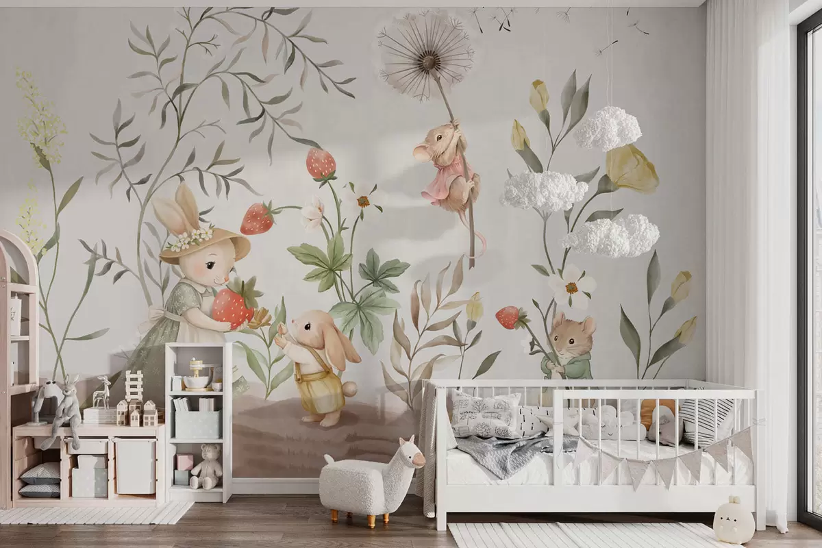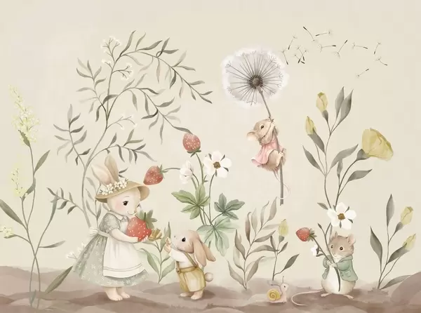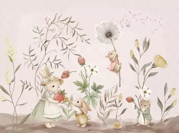 Тапете за зид Дечја илустрација зеке, миша међу биљкама и цвећем бр. w05422