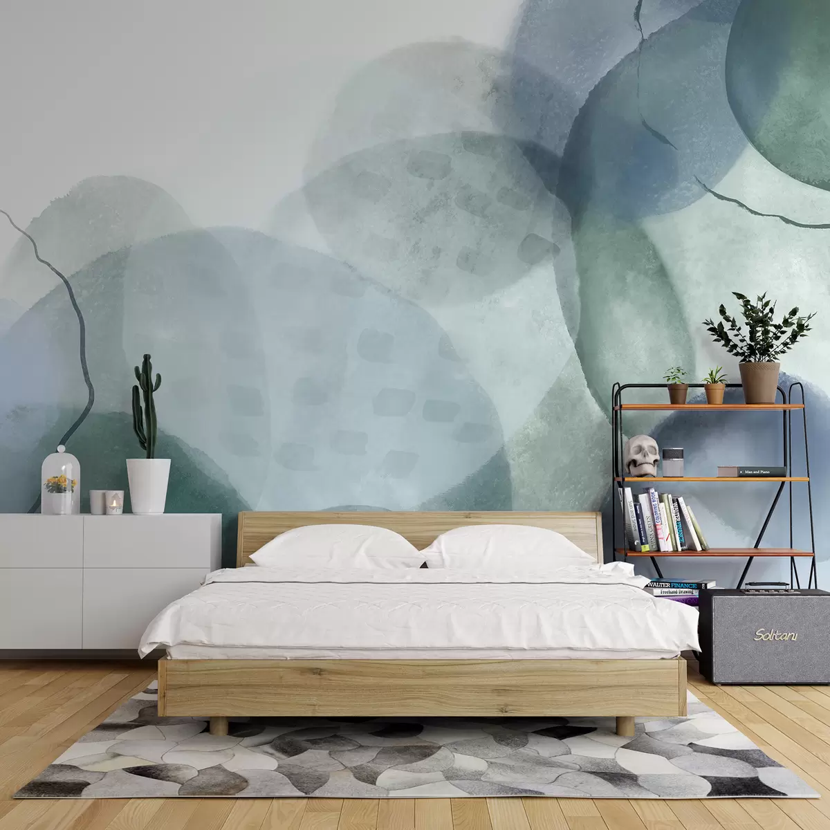 Тапете за зид Меки, акварелни апстрактни облици у нијансама плаве, зелене и беле бр. w07926