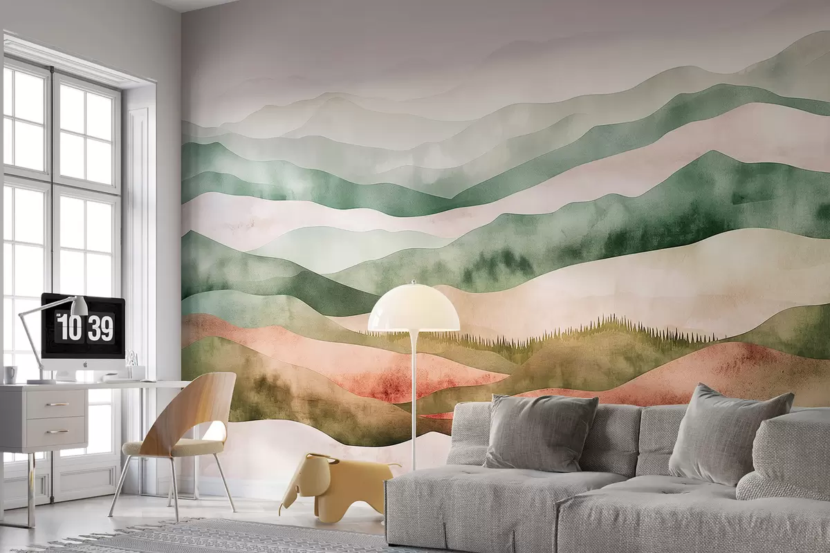 Тапете за зид Акварел планине пејзажи, шума, природа, зелене и беж боје бр. w07950v1