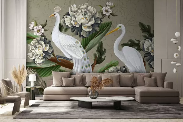 Тапете за зид Пар белих паунова са дугим реповима окружени великим цветовима белог божура и бујним зеленим лишћем бр. w07975