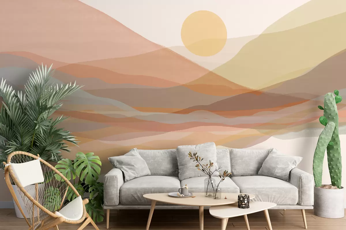 Тапете за зид Планински пејзаж са топлим сунцем на небу, валовитим брдима у нијансама наранџасте, жуте и браон бр. w07976