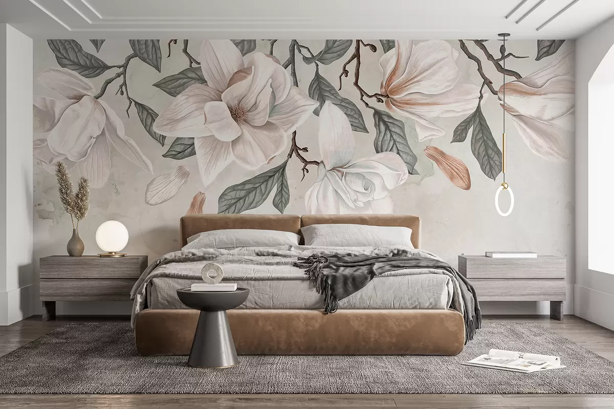 Тапете за зид Нежно розе и бело цвеће магнолије са зеленим листовима на светлој позадини, мека, цветна композиција бр. w07977