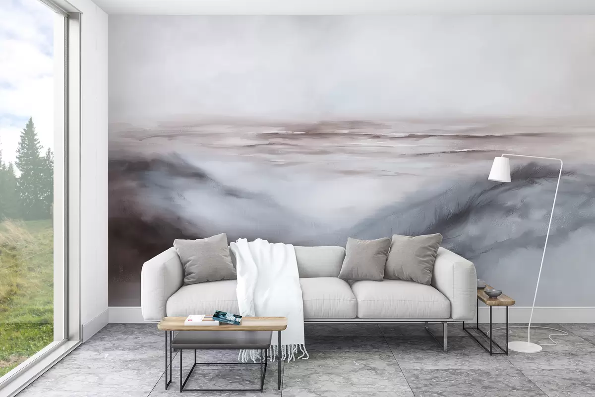 Тапете за зид Апстрактни пејзаж у пастелним бојама, потези четкице, плажа, море, палета сиве боје бр. w08141