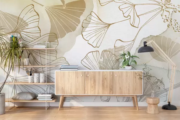 Тапете за зид Узорак деликатног лишћа гинка у нијансама беж, жутосмеђе и плаве на светлој позадини бр. w08157
