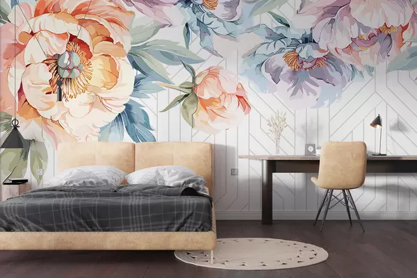 Тапете за зид Живописне брескве и ружичасти апстрактни божури са зеленим листовима на позадини беле и сиве шаре бр. w08183