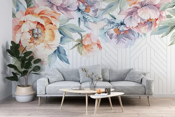 Тапете за зид Живописне брескве и ружичасти апстрактни божури са зеленим листовима на позадини беле и сиве шаре бр. w08183