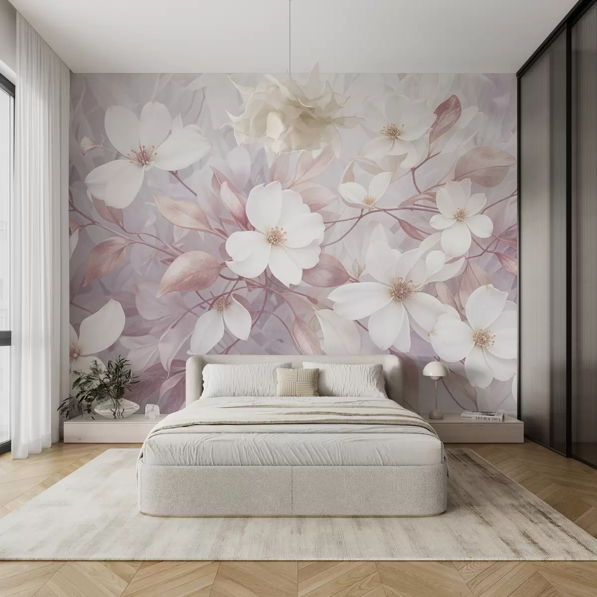 Тапете за зид Нежни ружичасти и бели цветови магнолије цветају на меким, замућеним гранама на бледој позадини бр. w08196