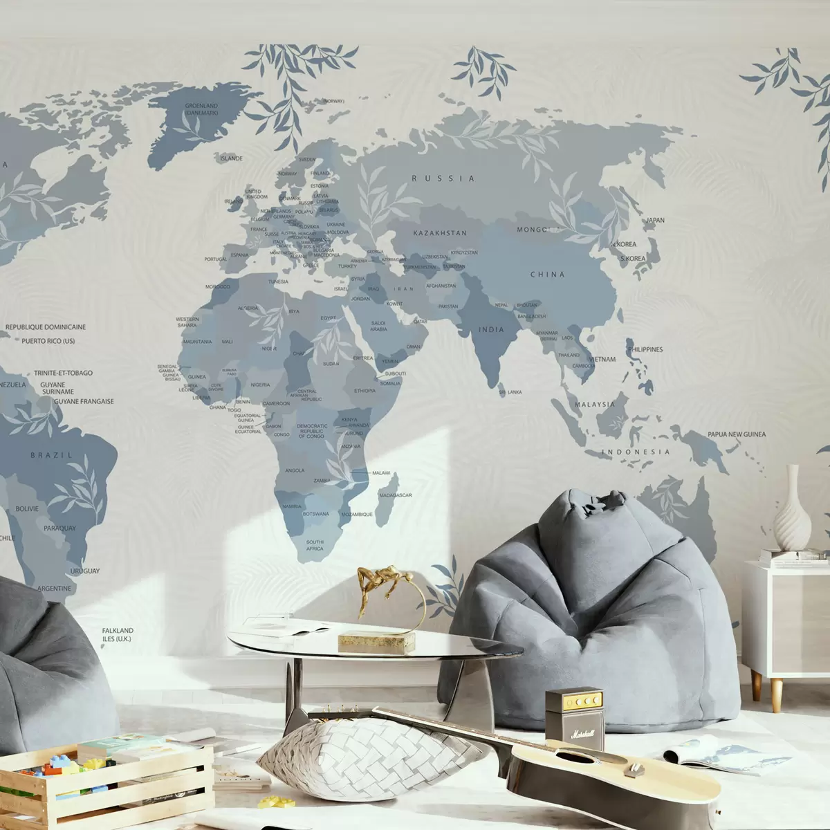 Тапете за зид Елегантна мапа света са лишћем и биљкама плаве боје бр. w08211v4