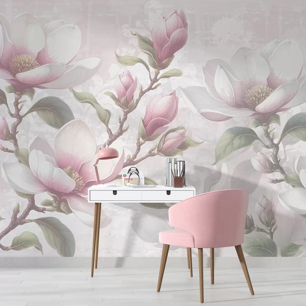 Тапете за зид Нежни ружичасти цветови магнолије у пуном цвету на мекој, замућеној позадини бр. w08216