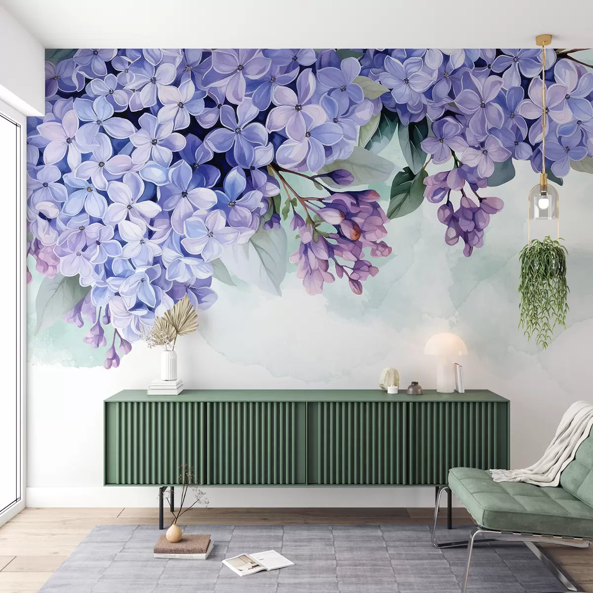 Тапете за зид Живољубичасти цветови хортензије са зеленим листовима, испуњавају оквир на мекој, замућеној позадини бр. w08223