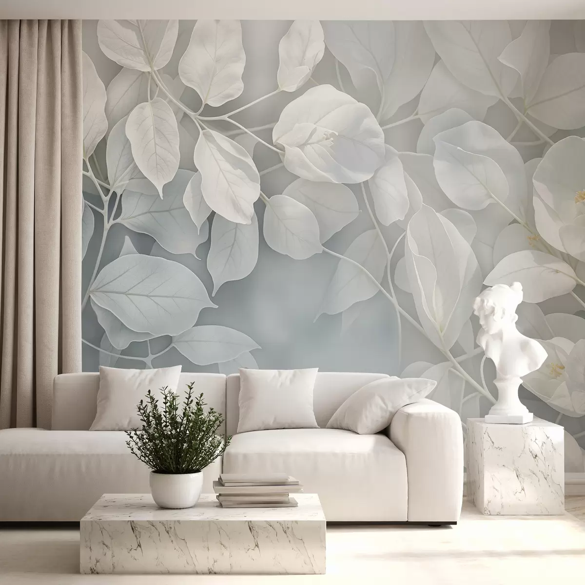 Тапете за зид Меко, нежно бело цвеће са сиво-зеленим листовима на замућеној позадини, стварајући спокојну атмосферу бр. w08232