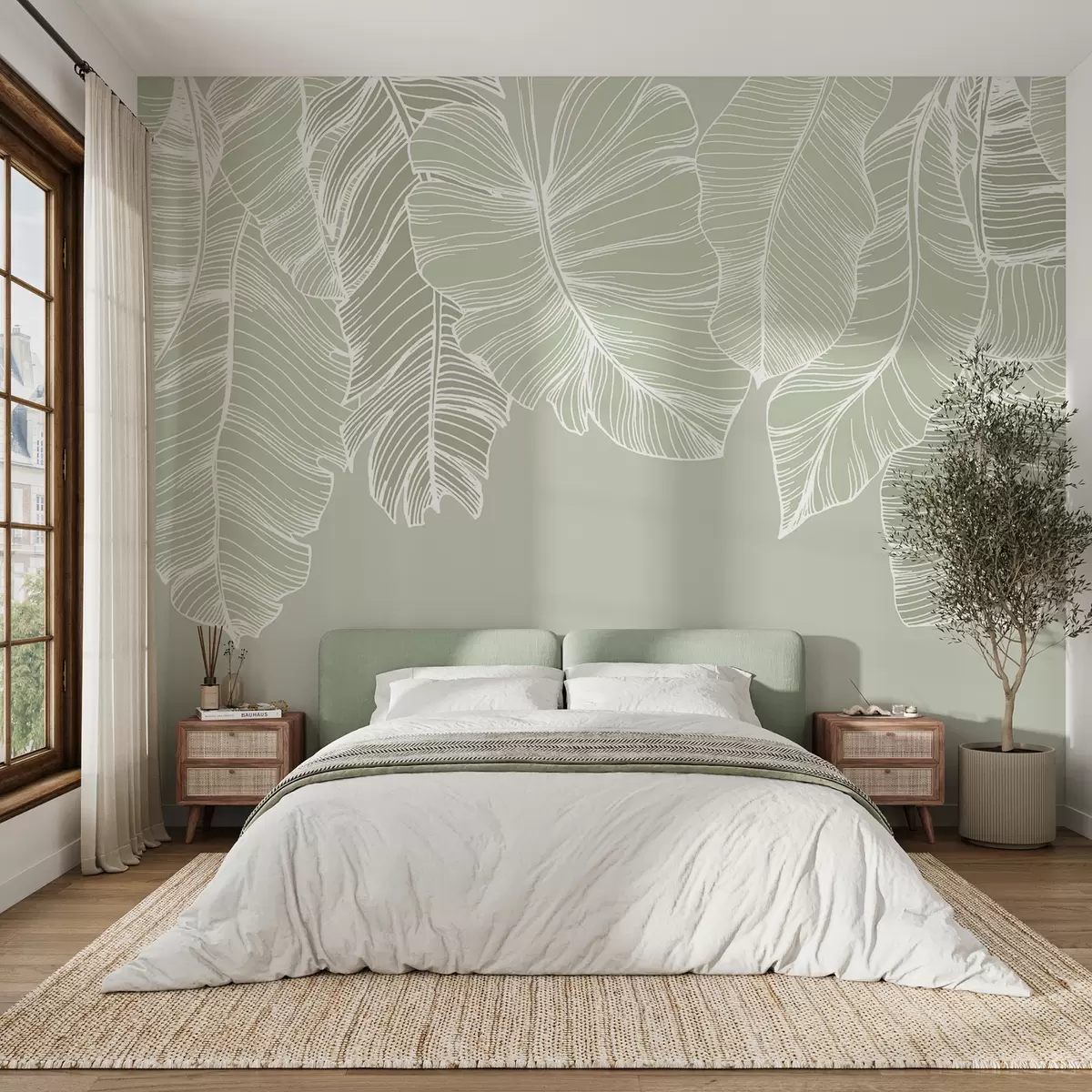 Тапете за зид Бели тропски цветни листови са светло зеленом позадином, минималистички уметнички дизајн бр. w08235v1