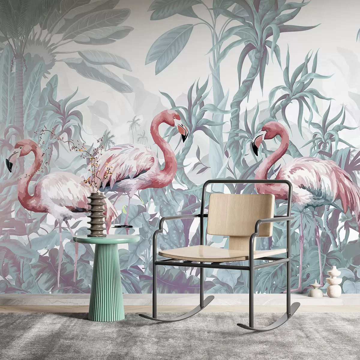 Тапете за зид Ружичасти фламингоси стоје у бујном, тропском лишћу са великим палминим листовима и цвећем у нијансама зелене и беле бр. w08250v1