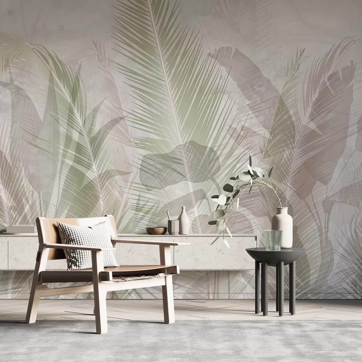 Тапете за зид Тропско палмино лишће у нежним пастелним бојама, са замућеном и магловитом текстурираном позадином бр. w08326