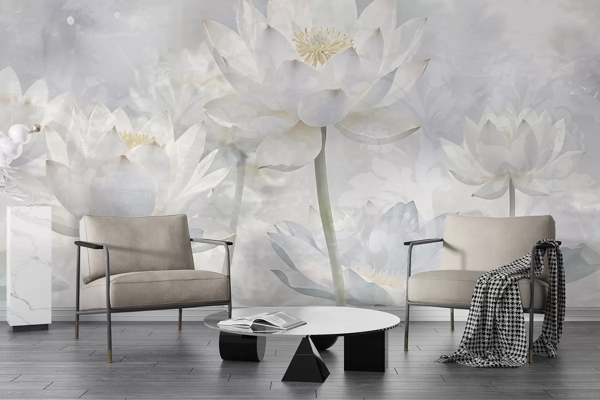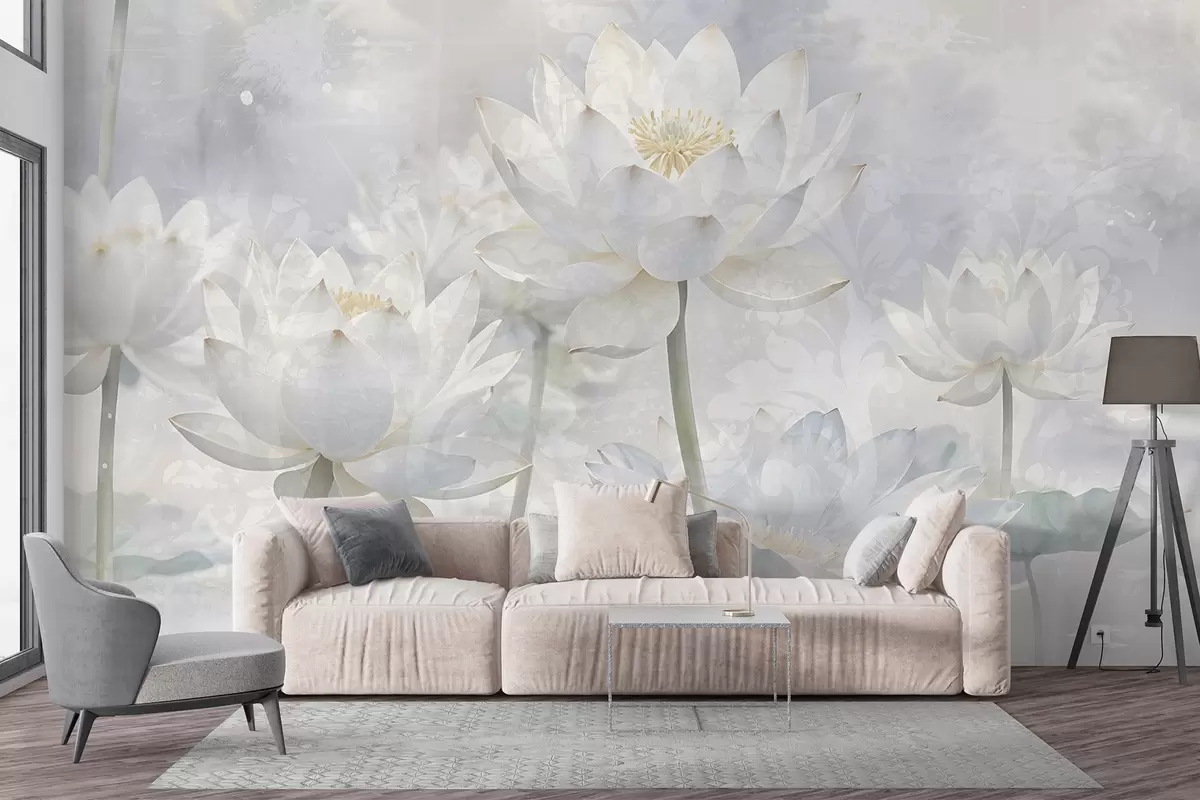 Тапете за зид Цвеће белог лотоса у магловитој, етеричној апстрактној пастелној позадини пејзажа бр. w08328