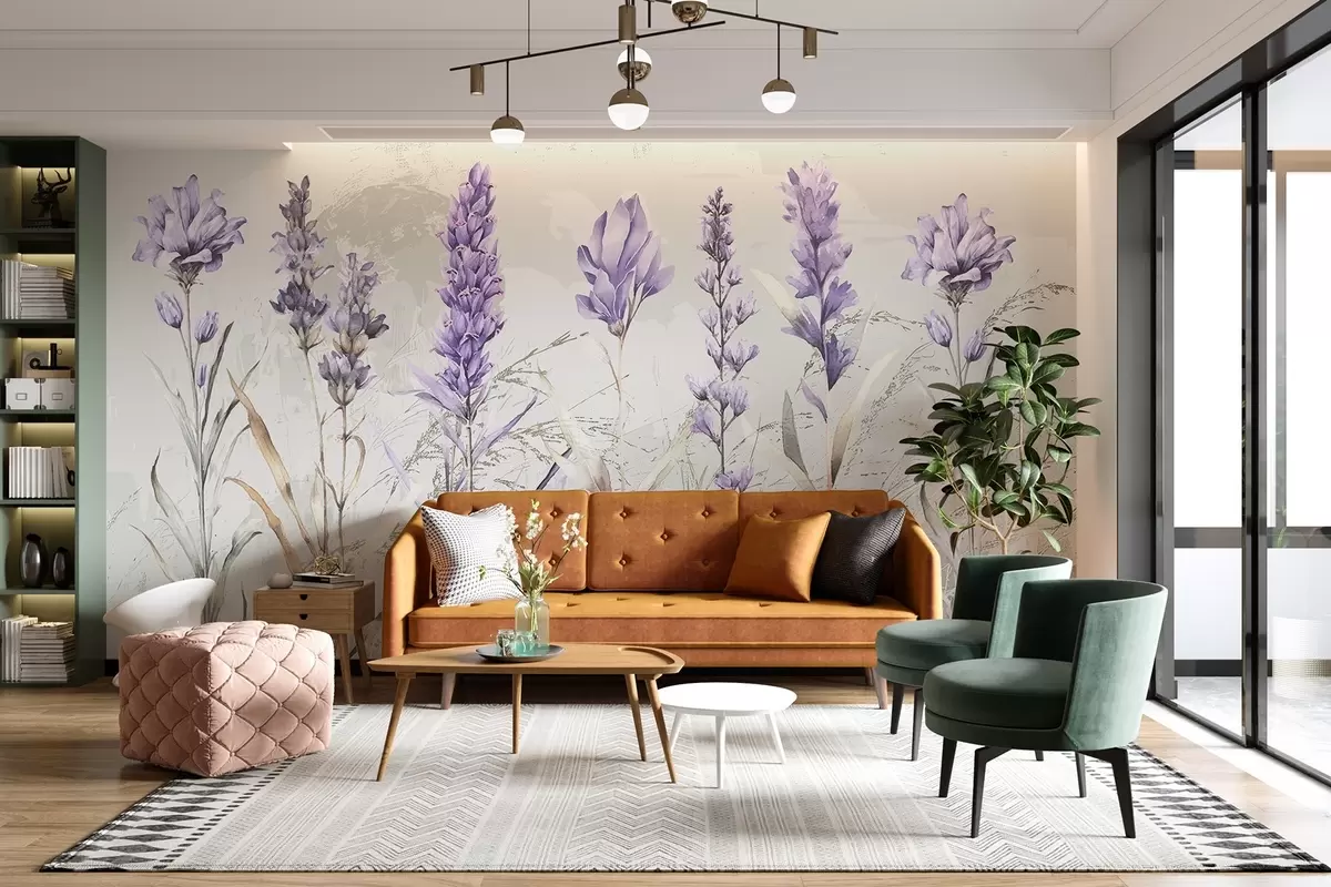 Тапете за зид Поље љубичастих акварелних цветова лаванде са меком, замућеном текстурираном беж позадином бр. w08346