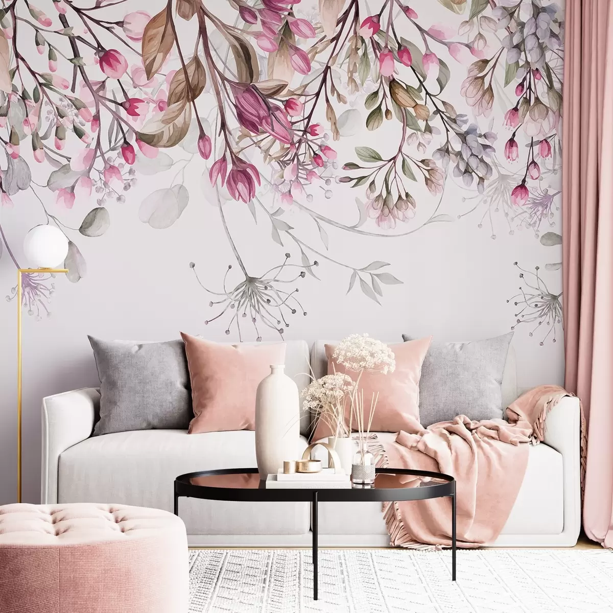 Тапете за зид Нежне розе и беле цветне гране са листовима и латицама, на пастелно сивој позадини бр. w08347