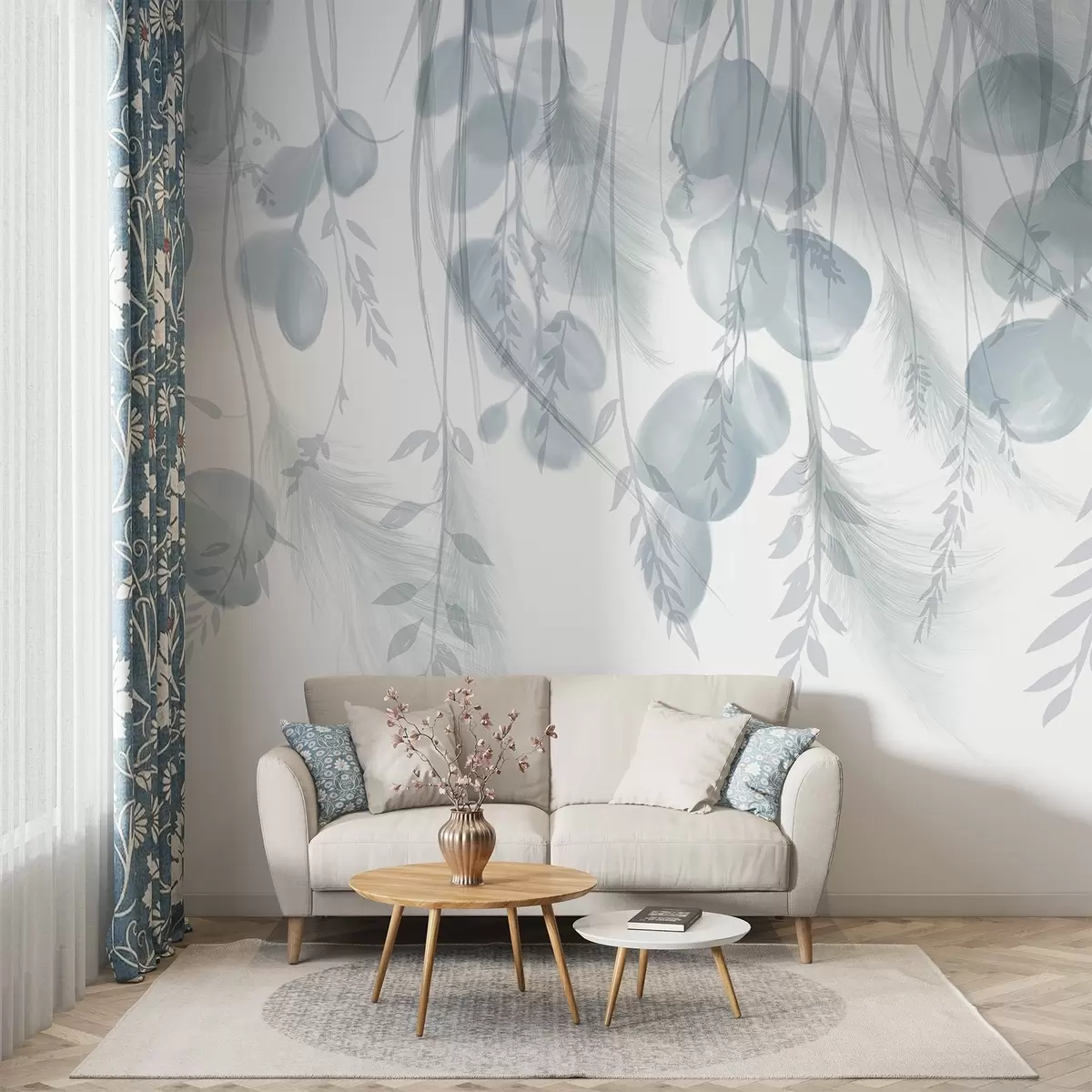 wall murals Деликатно сиво и пастелно зелено лишће еукалиптуса пада, стварајући спокојну и умирујућу атмосферу w08380