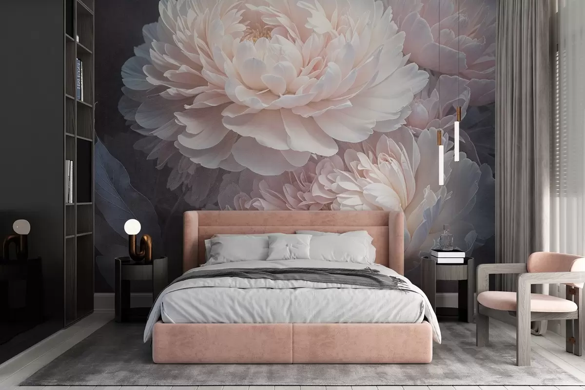 Тапете за зид Крупни план два велика, деликатна ружичаста божура са меким, паперјастим латицама и листовима на замућеној позадини бр. w08382