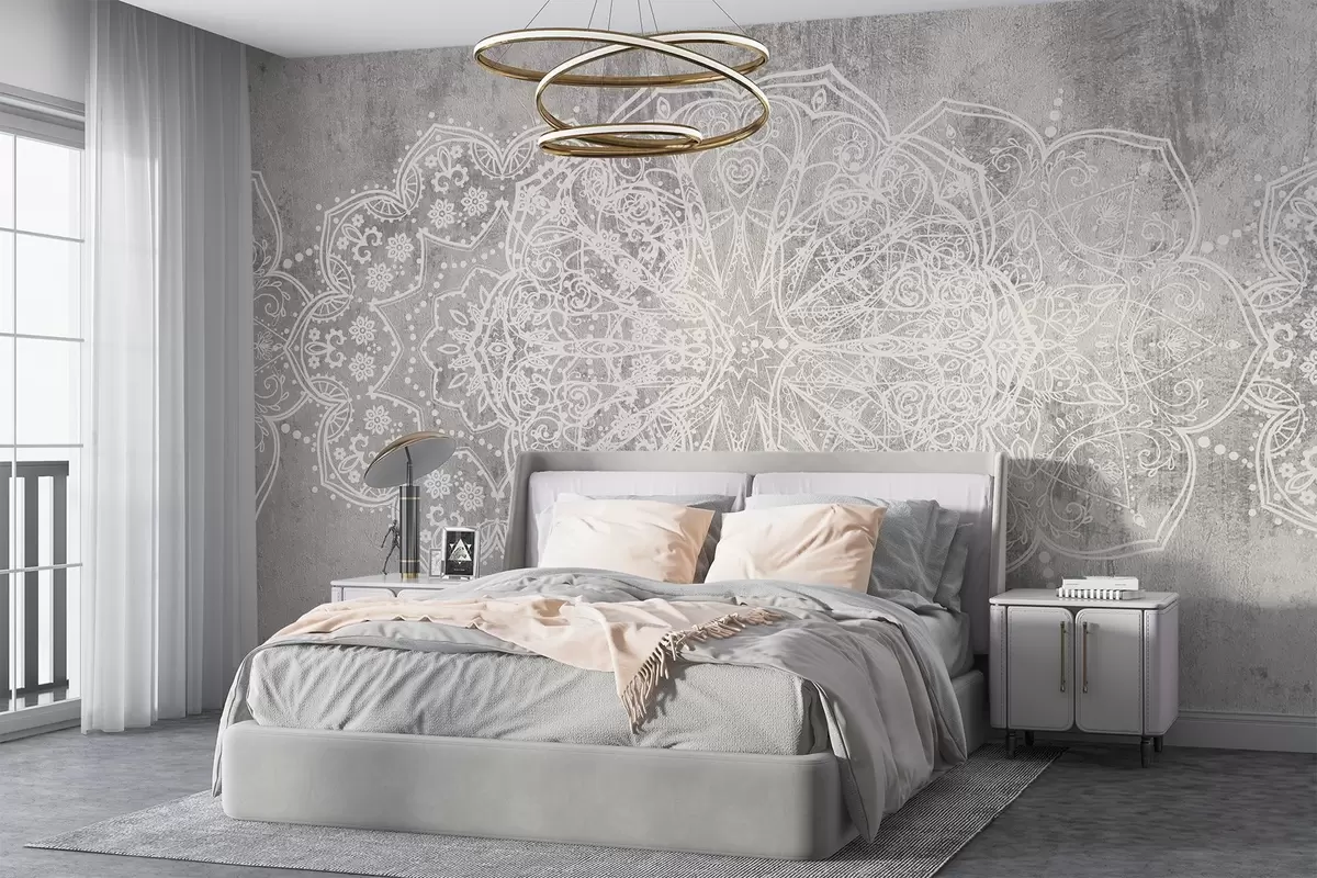 Тапете за зид Детаљан, сложен узорак мандале од беле чипке на текстурираној позадини сивог зида у поткровљу бр. w08387