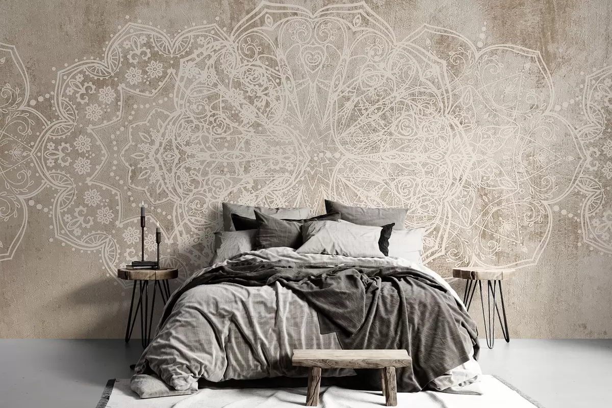 Тапете за зид Детаљан, сложен узорак мандале од беле чипке на текстурираној позадини беж-браон зида у поткровљу бр. w08387v1