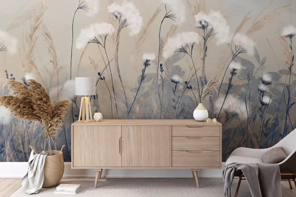 wall murals Пахуљаста бела памучна трава на замућеној текстурној позадини, са меком, магловитом и спокојном атмосфером w08416