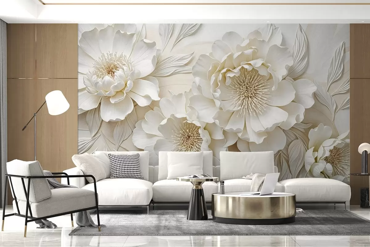 Тапете за зид Елегантне обимне имитације цветова белог божура са меким латицама и пастелно жутим срединама, на светлој позадини бр. w08431