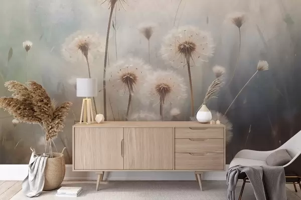 Тапете за зид Цвеће маслачка меког фокуса у пољу, са замућеном текстурираном позадином пастелних боја бр. w08432
