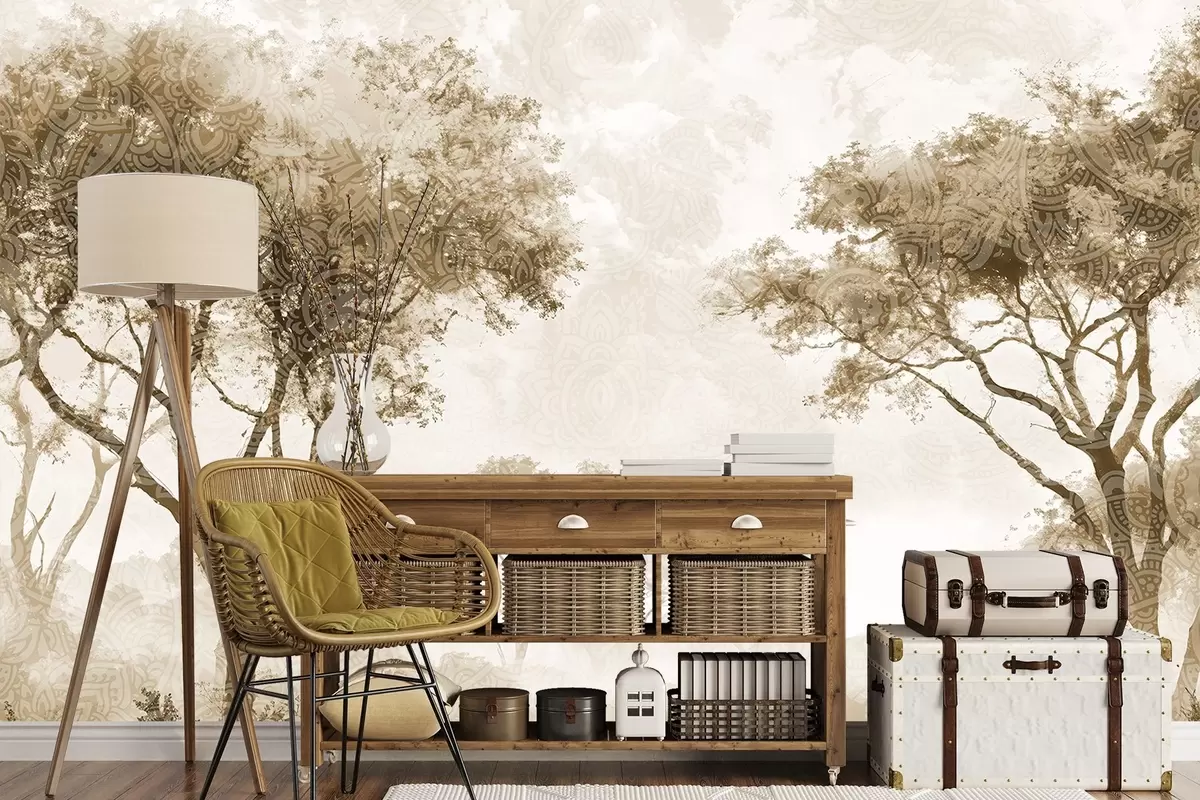 Тапете за зид Магловит, спокојан пејзаж са силуетираним дрвећем у првом плану са меком маглом у нијансама браон и беж бр. w08442v2
