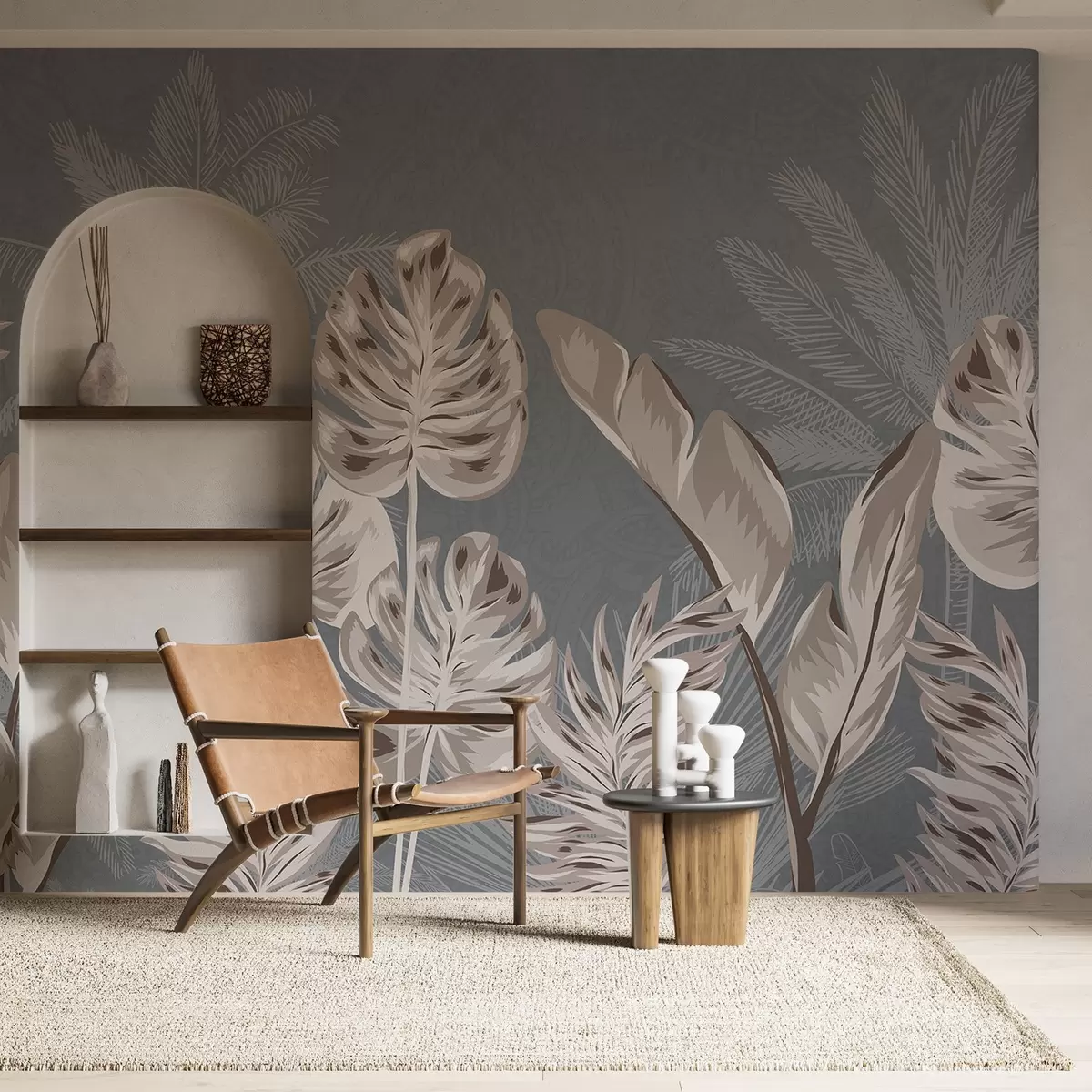 Тапете за зид Велики, деликатни беж листови на пригушеној сивој позадини, стварајући спокојну и етеричну атмосферу бр. w08449