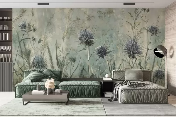 Тапете за зид Поље љубичастих цветова чичка са замагљеним цветовима и лишћем у старинској текстурној позадини бр. w08463