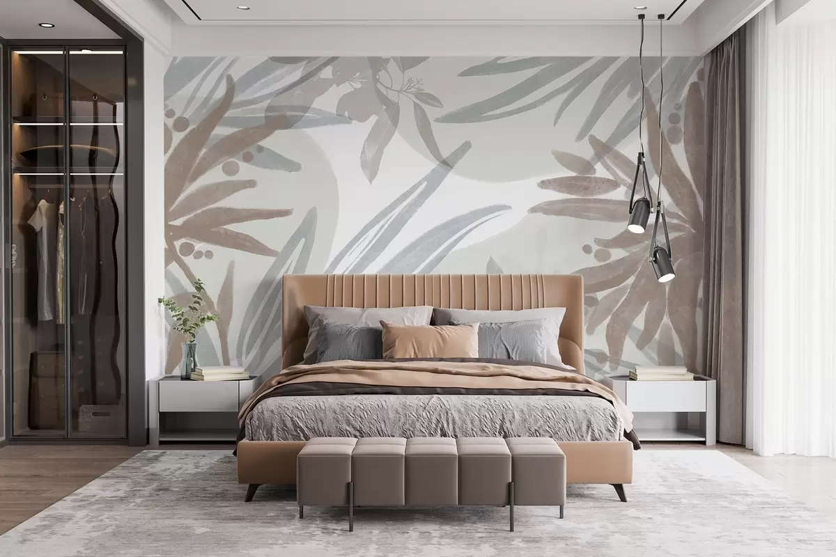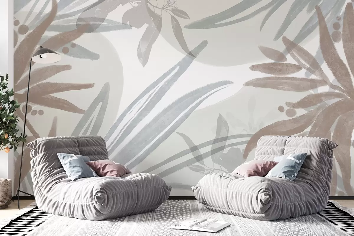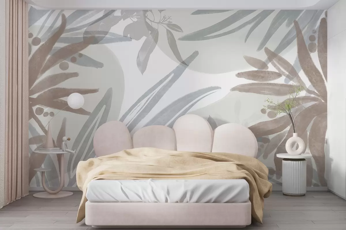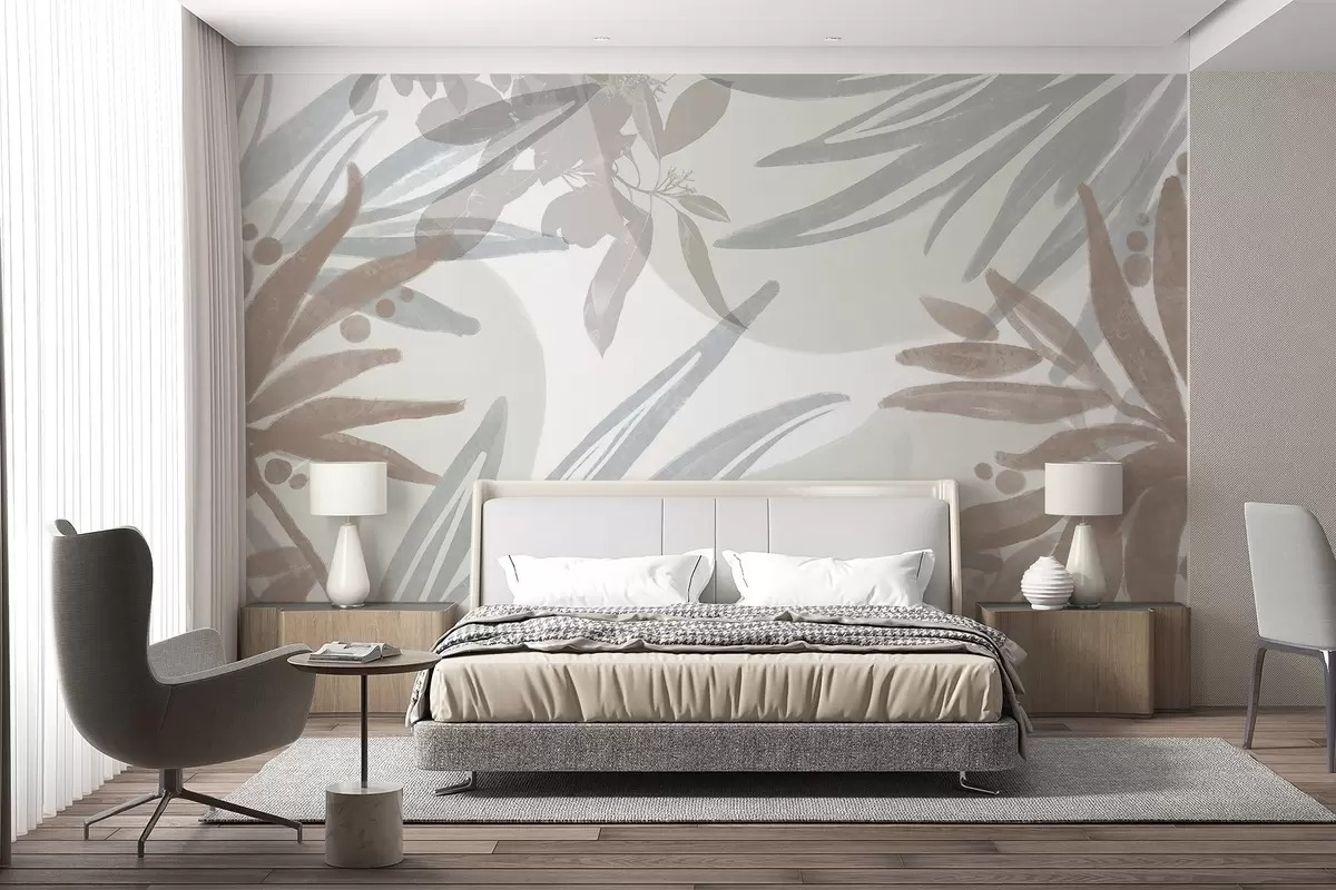 Тапете за зид Апстрактни цветни узорак неутралних тонова са преклапајућим листовима и облицима у нијансама сиве, беле и беж бр. w08464