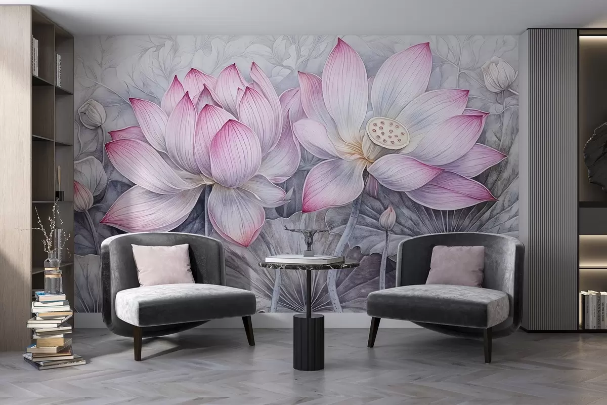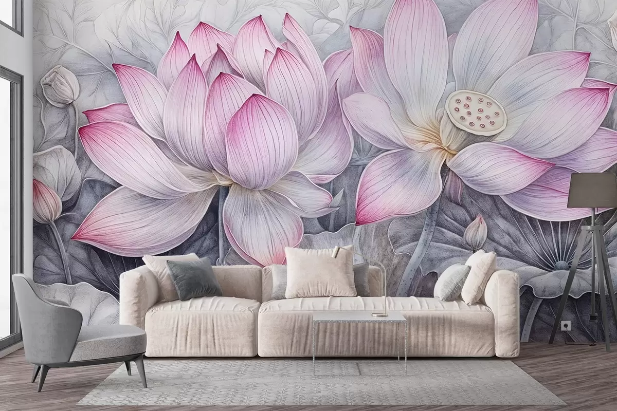 Тапете за зид Неколико детаљних текстурираних великих ружичастих цветова лотоса са сиво-зеленим листовима и стабљикама на светлој позадини бр. w08465