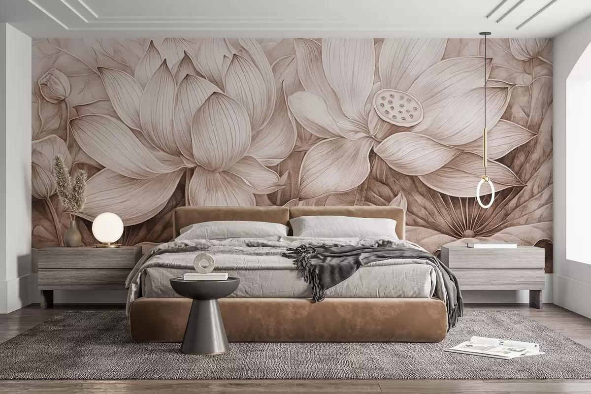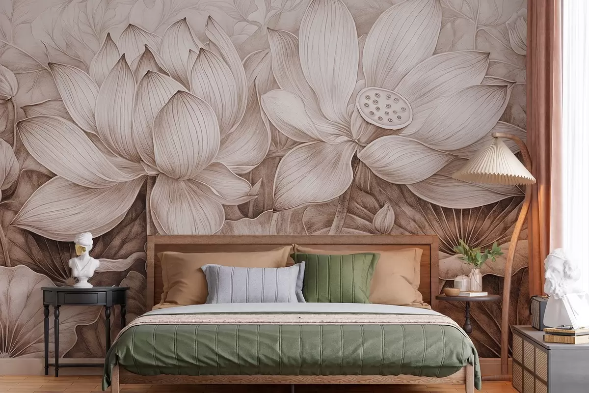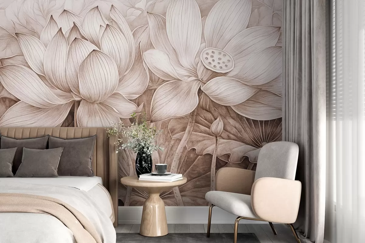 Тапете за зид Неколико детаљних текстурираних великих цветова лотоса беж боје са смеђим листовима и стабљикама на светлој позадини бр. w08465v1