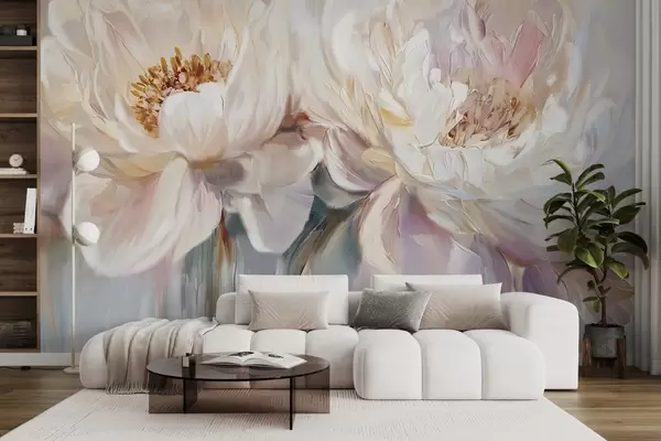 Тапете за зид Меки, деликатни бели и пастелно ружичасти божури са бујним латицама на замућеној позадини имитације слике бр. w08466